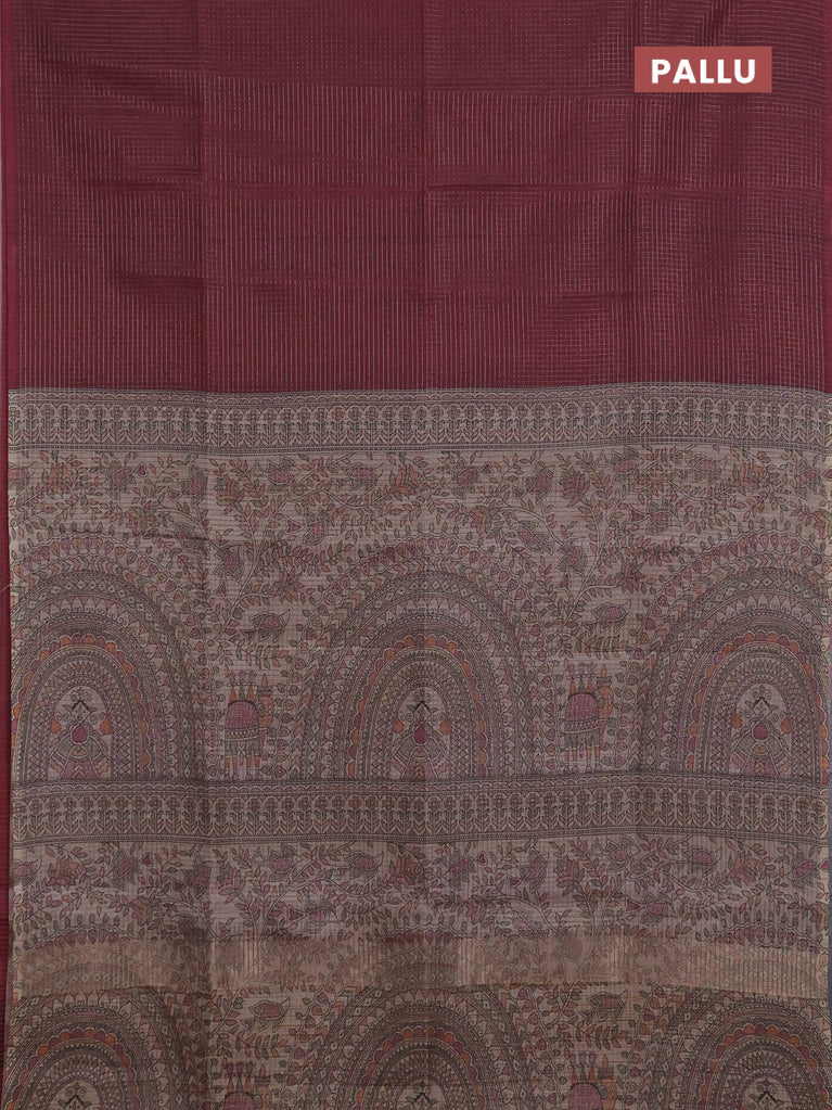 Chappa saree maroon and beige with allover small zari checked pattern and madhubani printed pallu