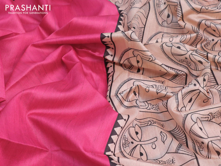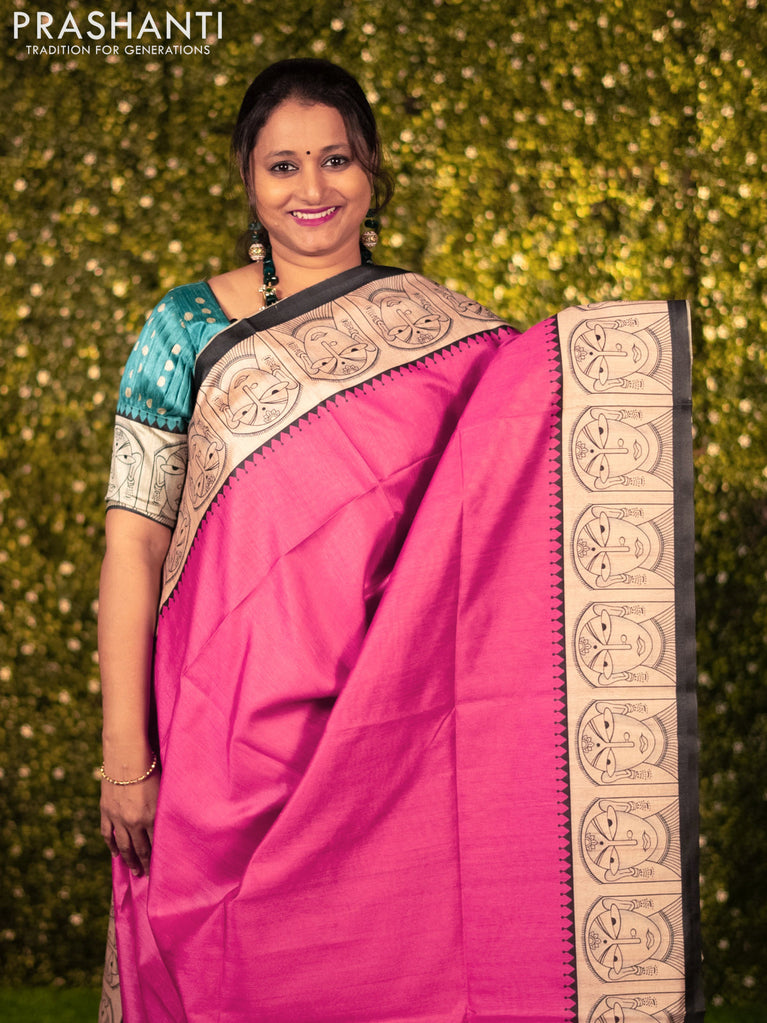 Chappa saree peach pink and black with allover small zari checked pattern & floral digital prints and ganga jamuna border