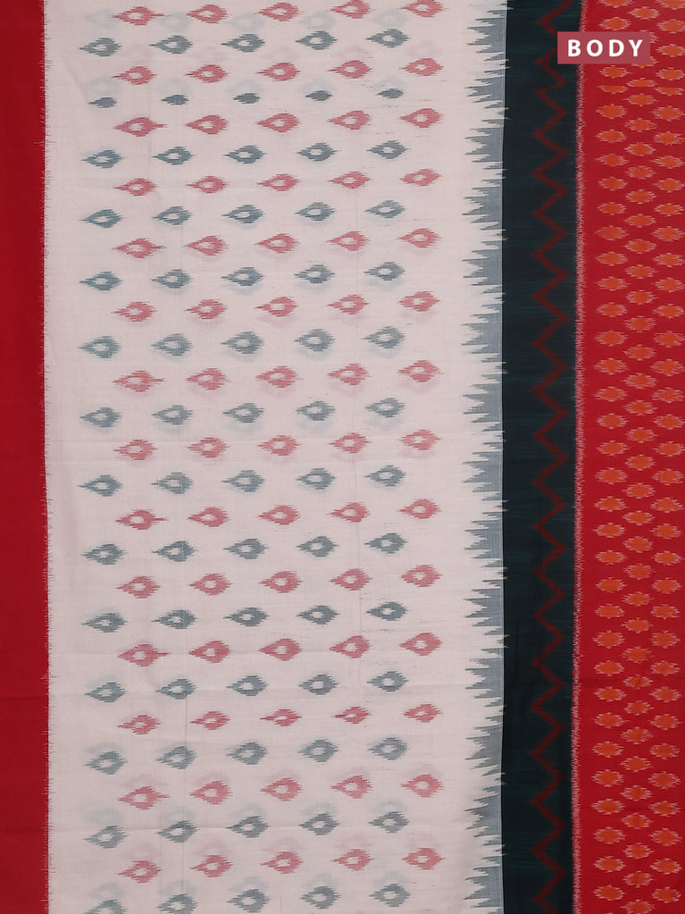 Ikat cotton saree off white and peacock green red with allover ikat butta weaves and long ikat style border