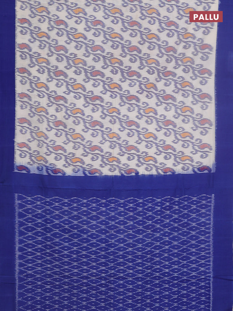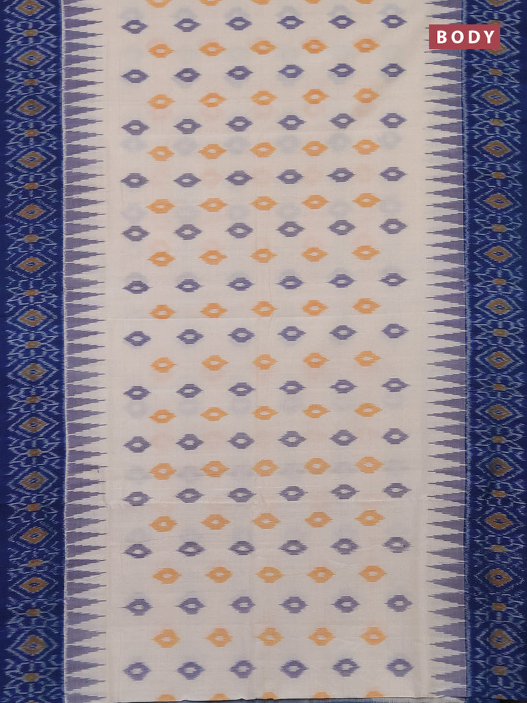 Ikat cotton saree off white and blue with allover ikat butta weaves and temple design ikat style border