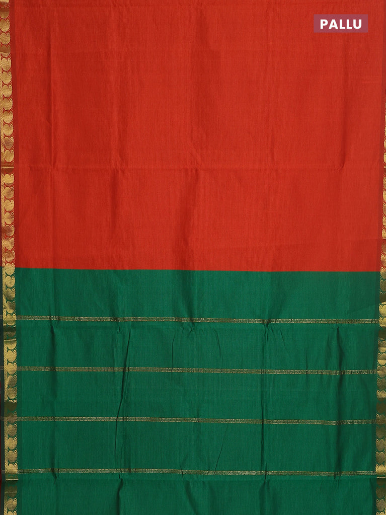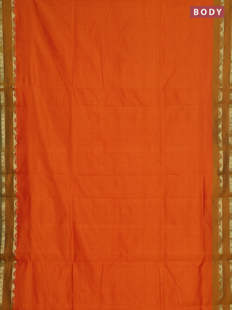 10 yards Poly cotton saree orange and green with plain body and rettapet zari woven border