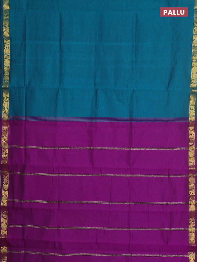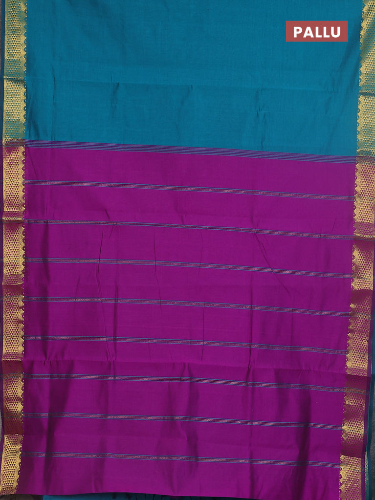 10 yards Poly cotton saree teal green and purple with plain body and rettapet zari woven border