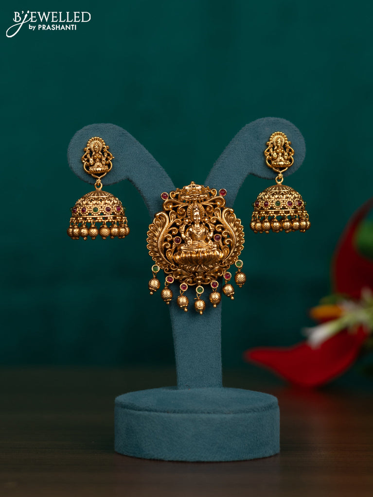 Antique pendant set lakshmi design with kemp & cz stones pearl hangings