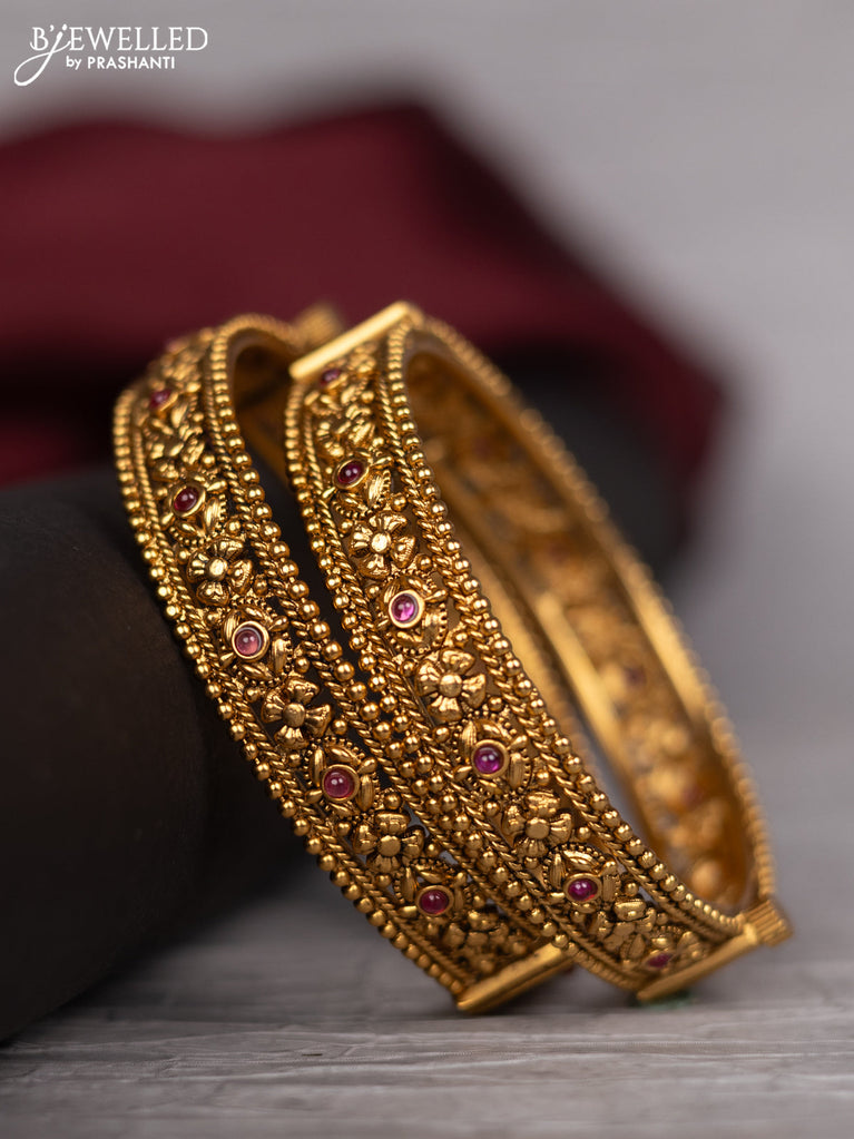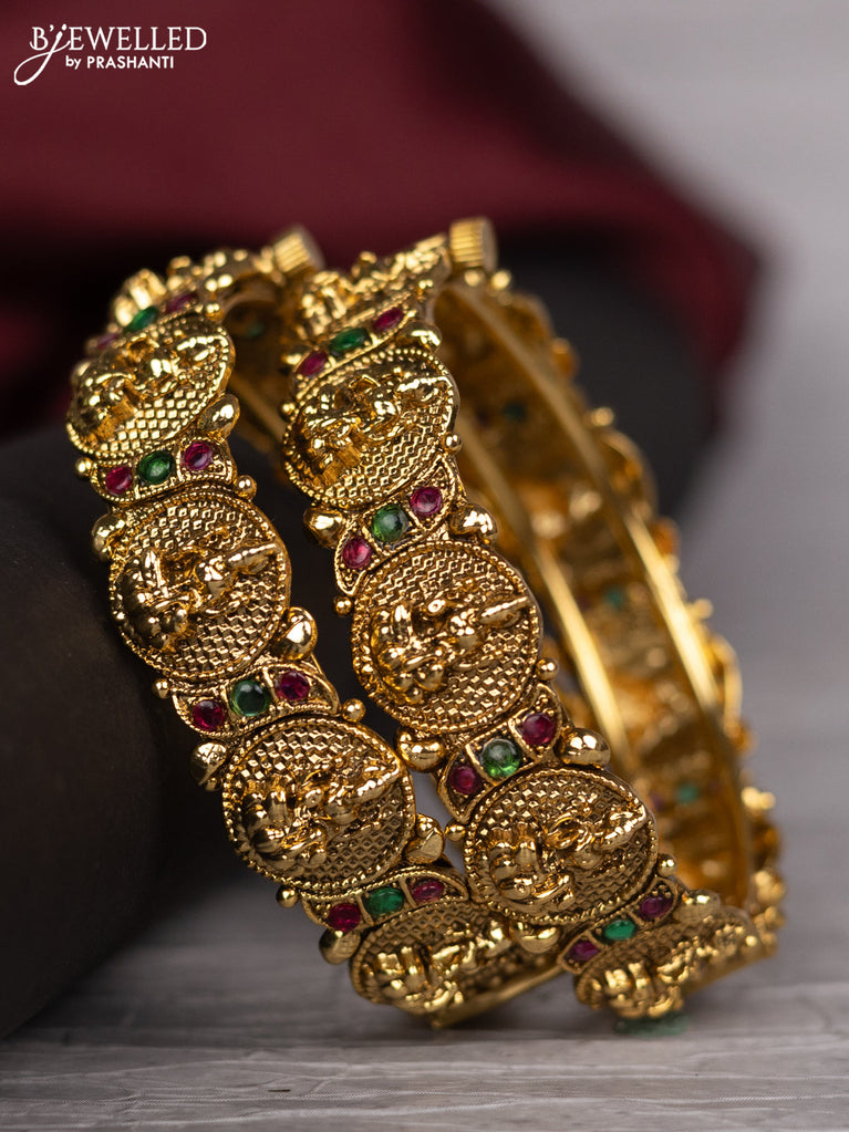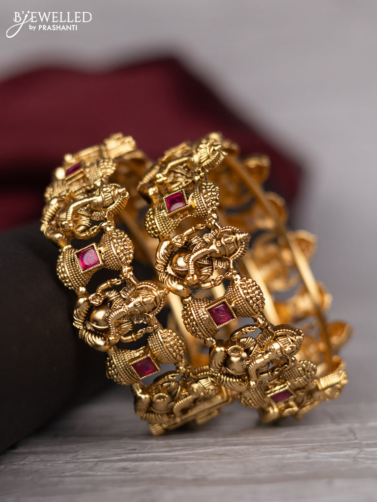 Antique screw type bangle with lakshmi design and pink kemp stones