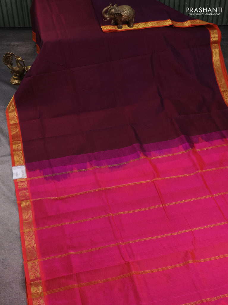 10 yards silk cotton saree wine shade and dual shade of pinkish orange with plain body and zari woven border