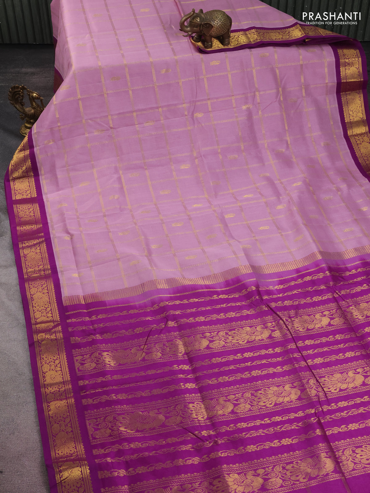 10 yards silk cotton saree light pink and purple with allover zari checks & buttas and zari woven border