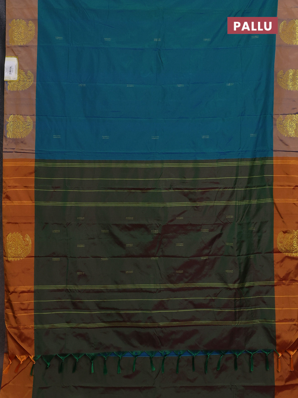 Arani semi silk saree teal blue shade and dual shade of mustard with zari woven buttas and paisley zari woven butta border