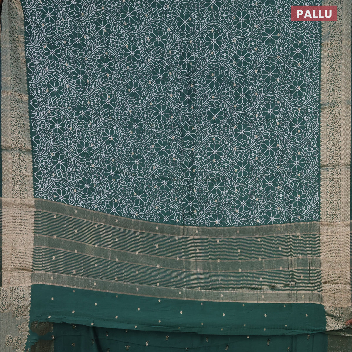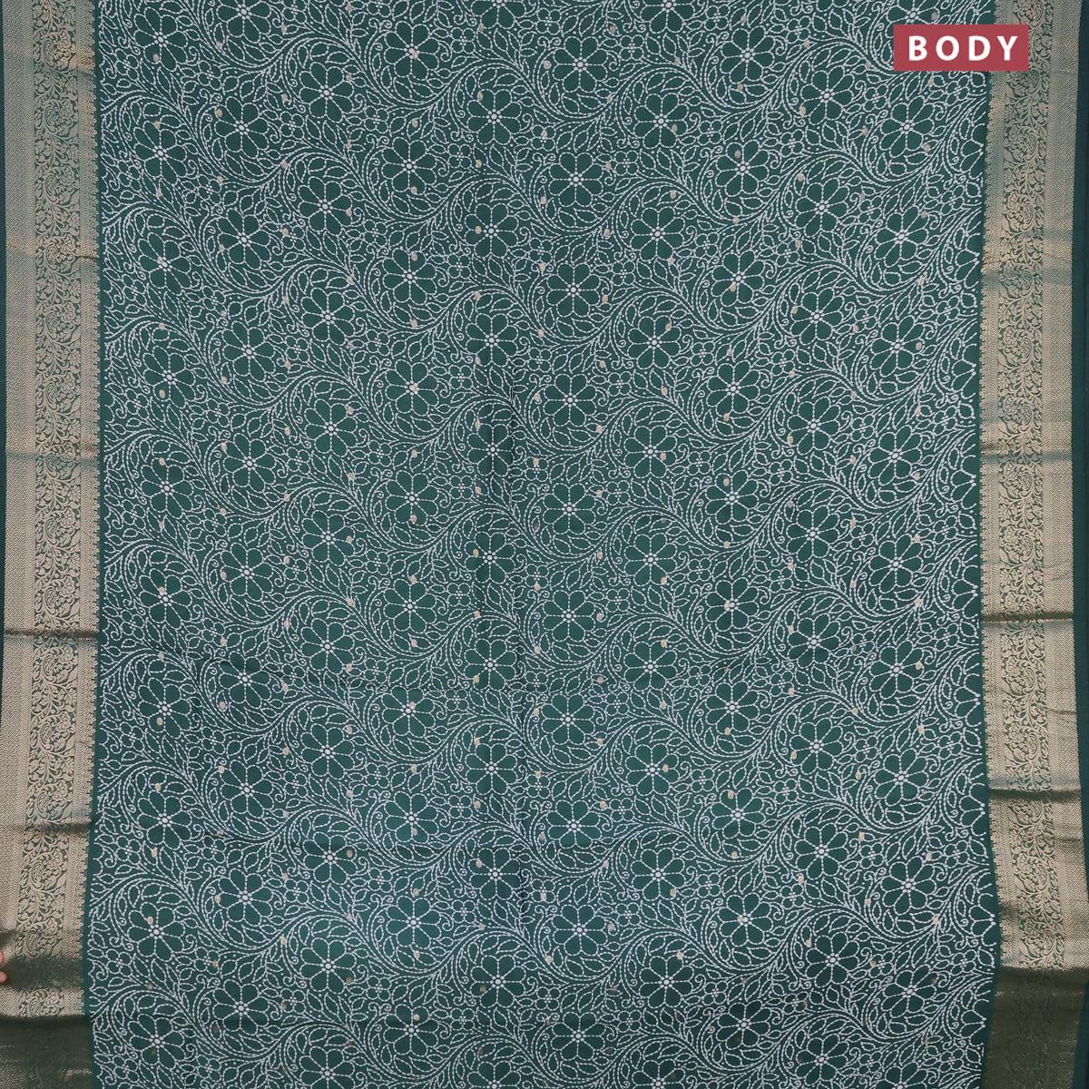 Assam silk saree dark green with allover floral prints & zari buttas and zari woven border