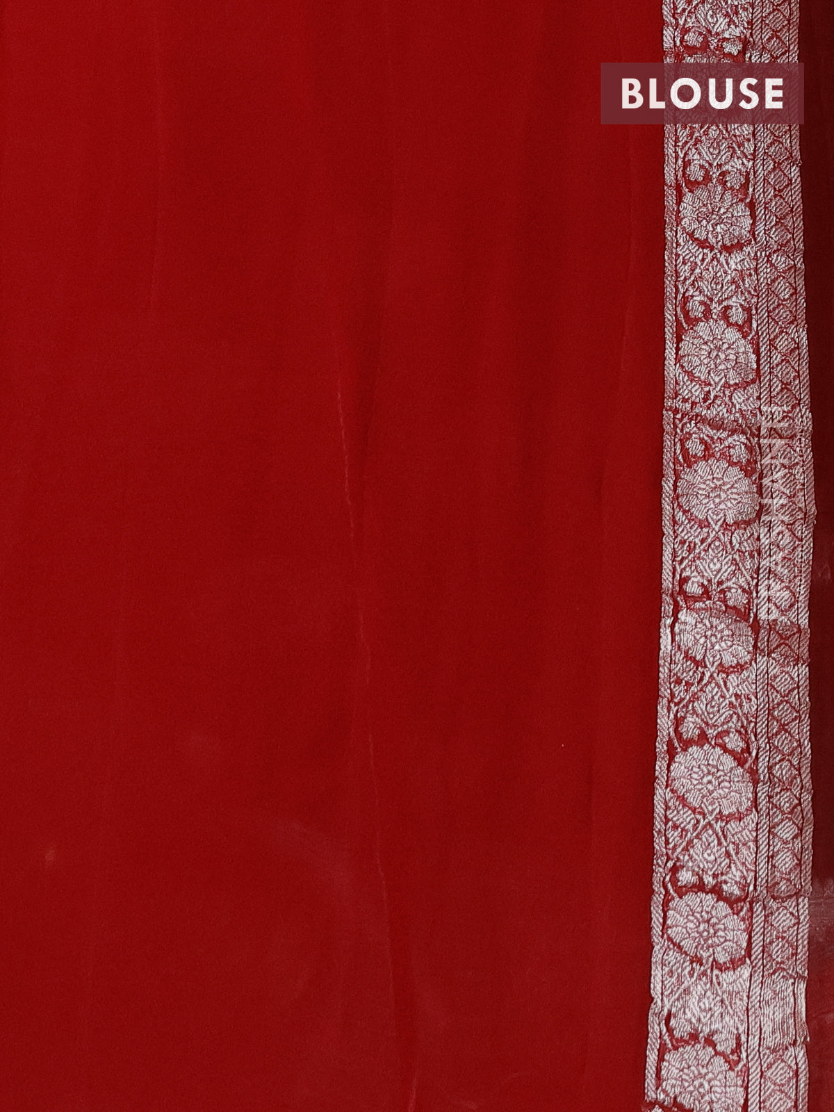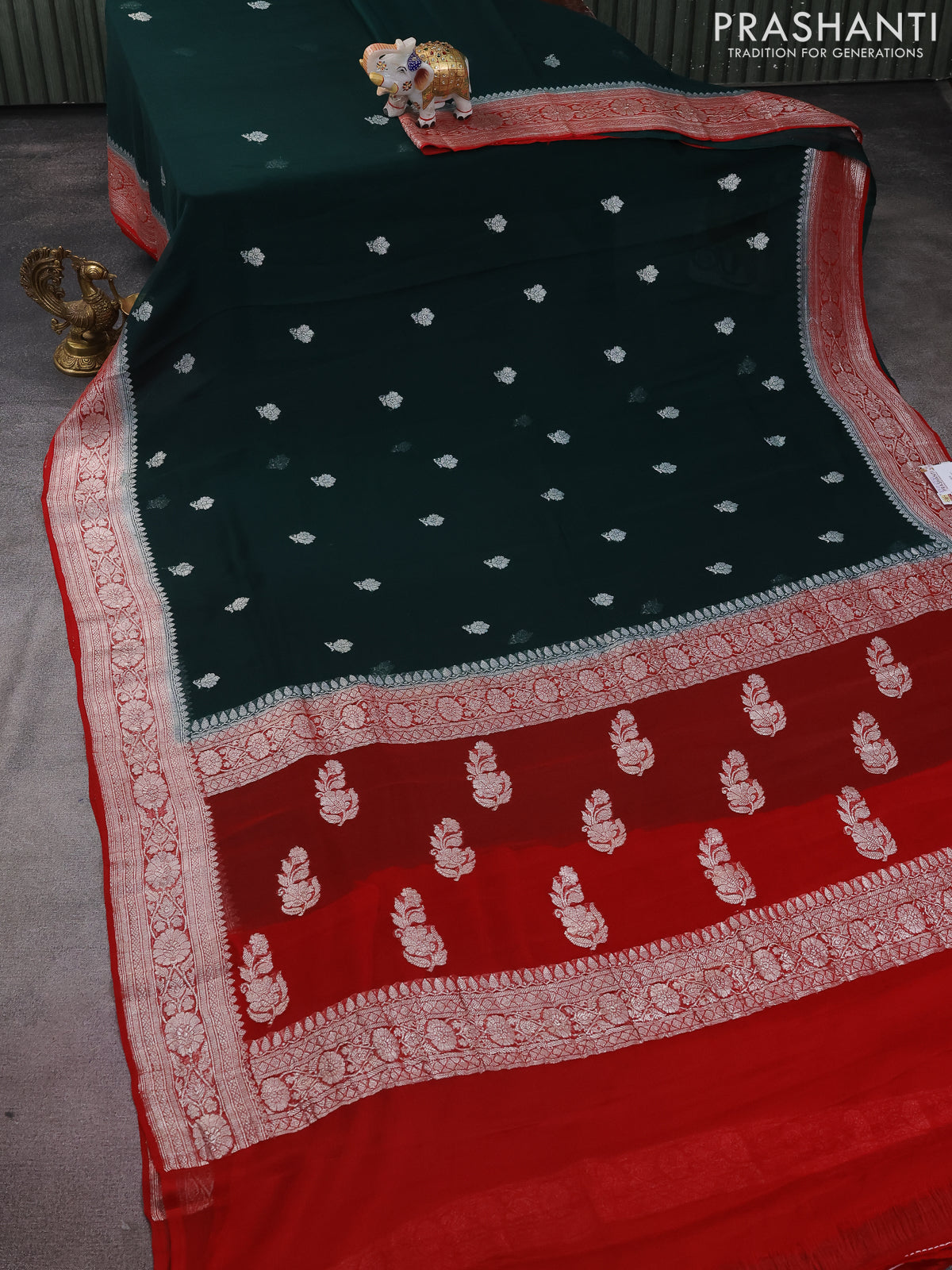 Banarasi chiffon silk saree bottle green and red with silver zari woven buttas and silver zari woven border