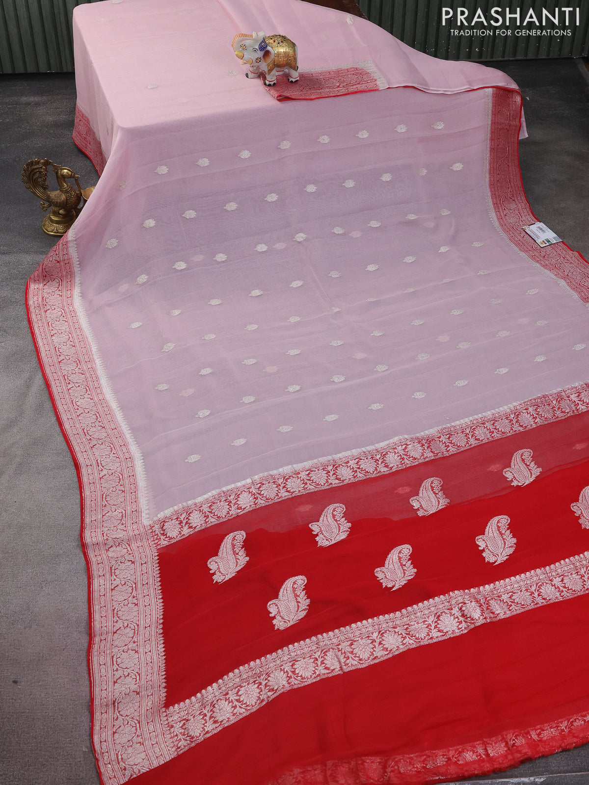 Banarasi chiffon silk saree pastel pink and red with silver zari woven buttas and floral silver zari woven border