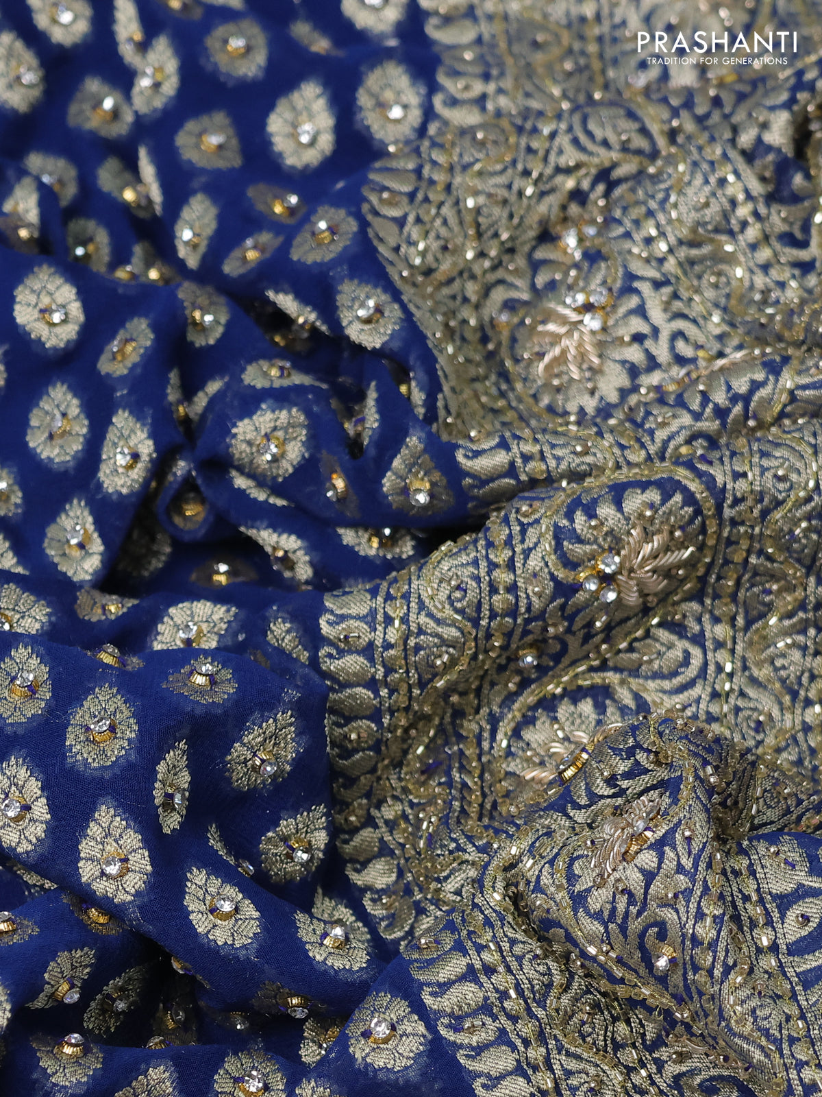 Banarasi georgette saree peacock blue with woven buttas & stone work and zardosi work border