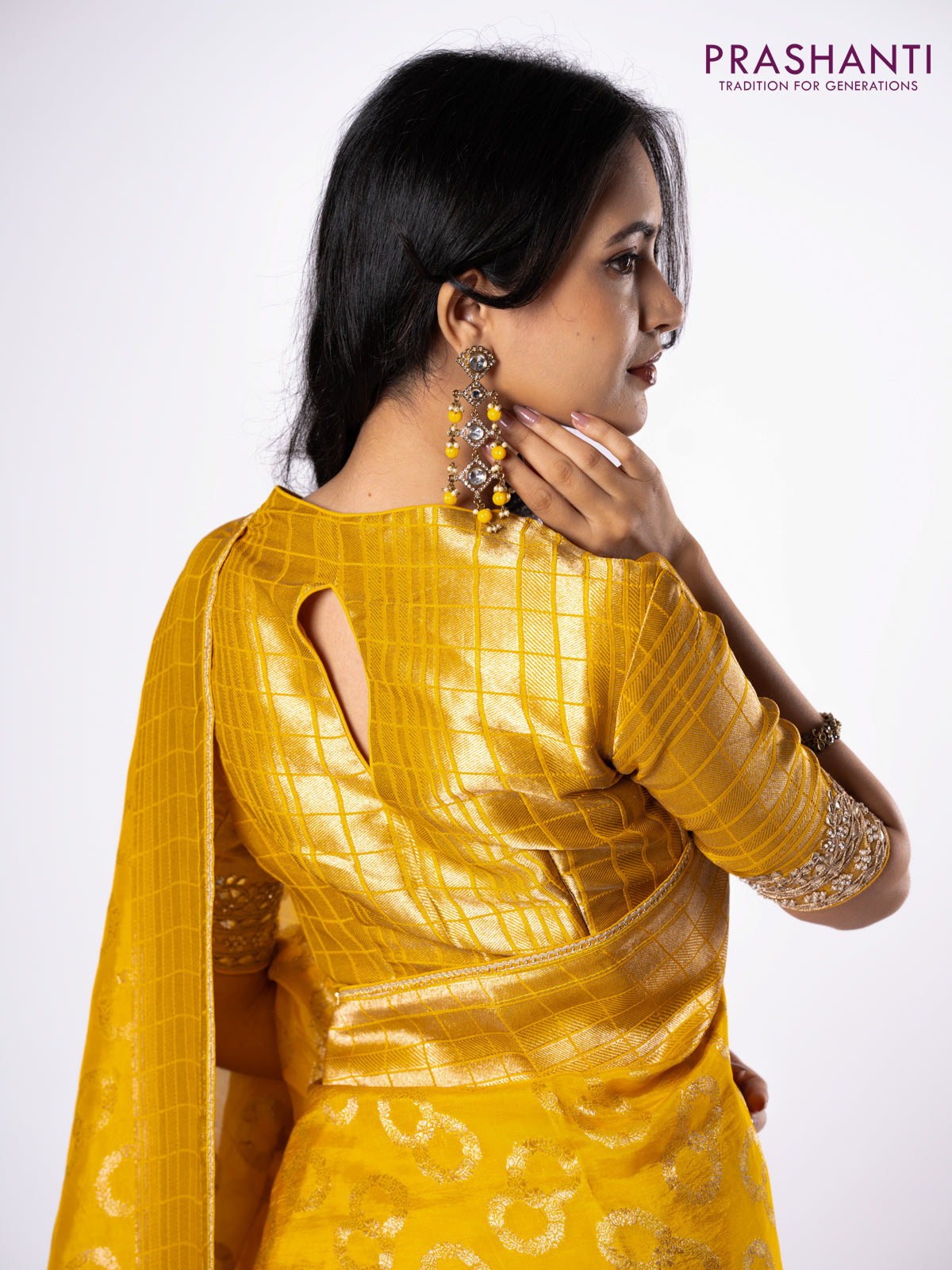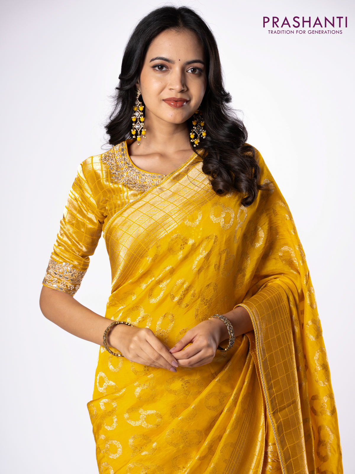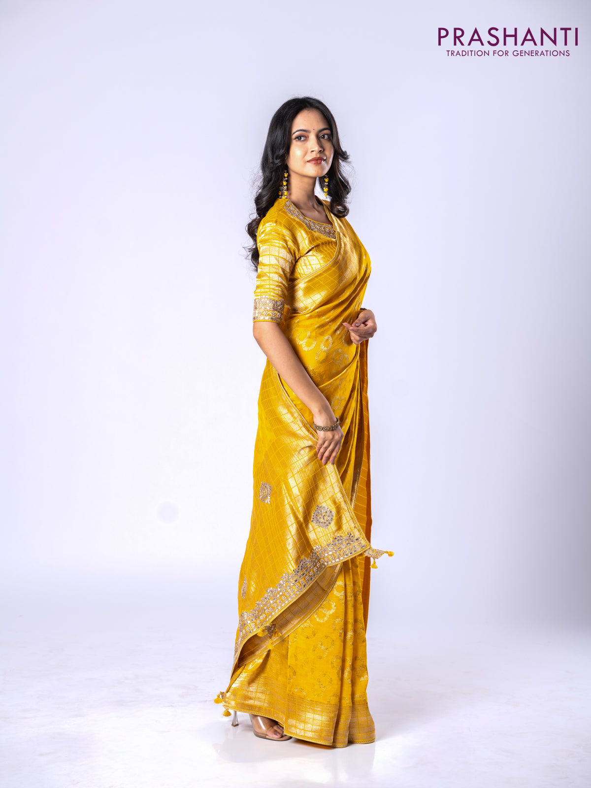 Banarasi munga silk saree yellow with allover silver & gold zari weaves and zari woven lace border