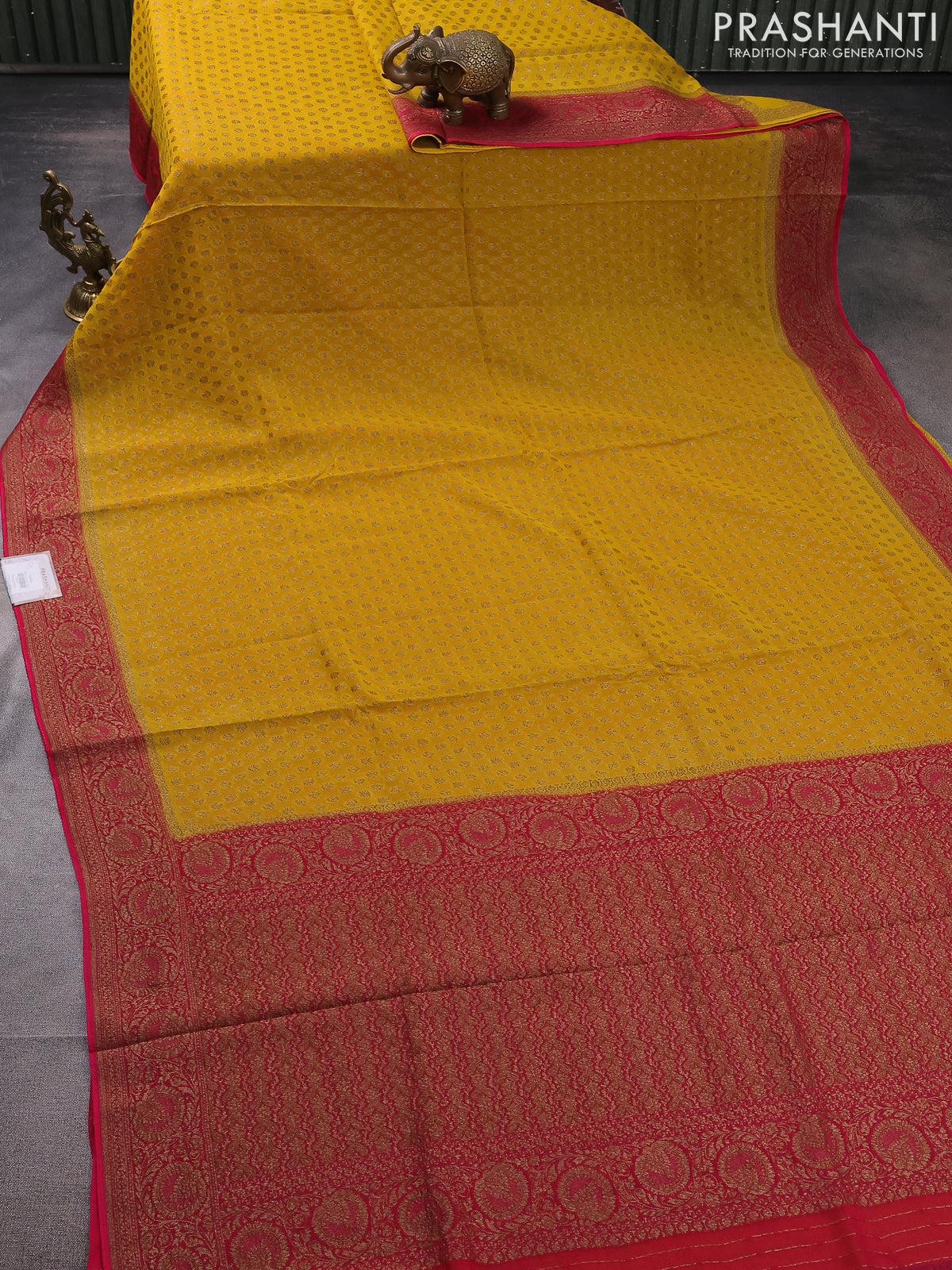 Banarasi semi georgette saree mustard yellow and pink with allover thread & zari woven buttas and woven border