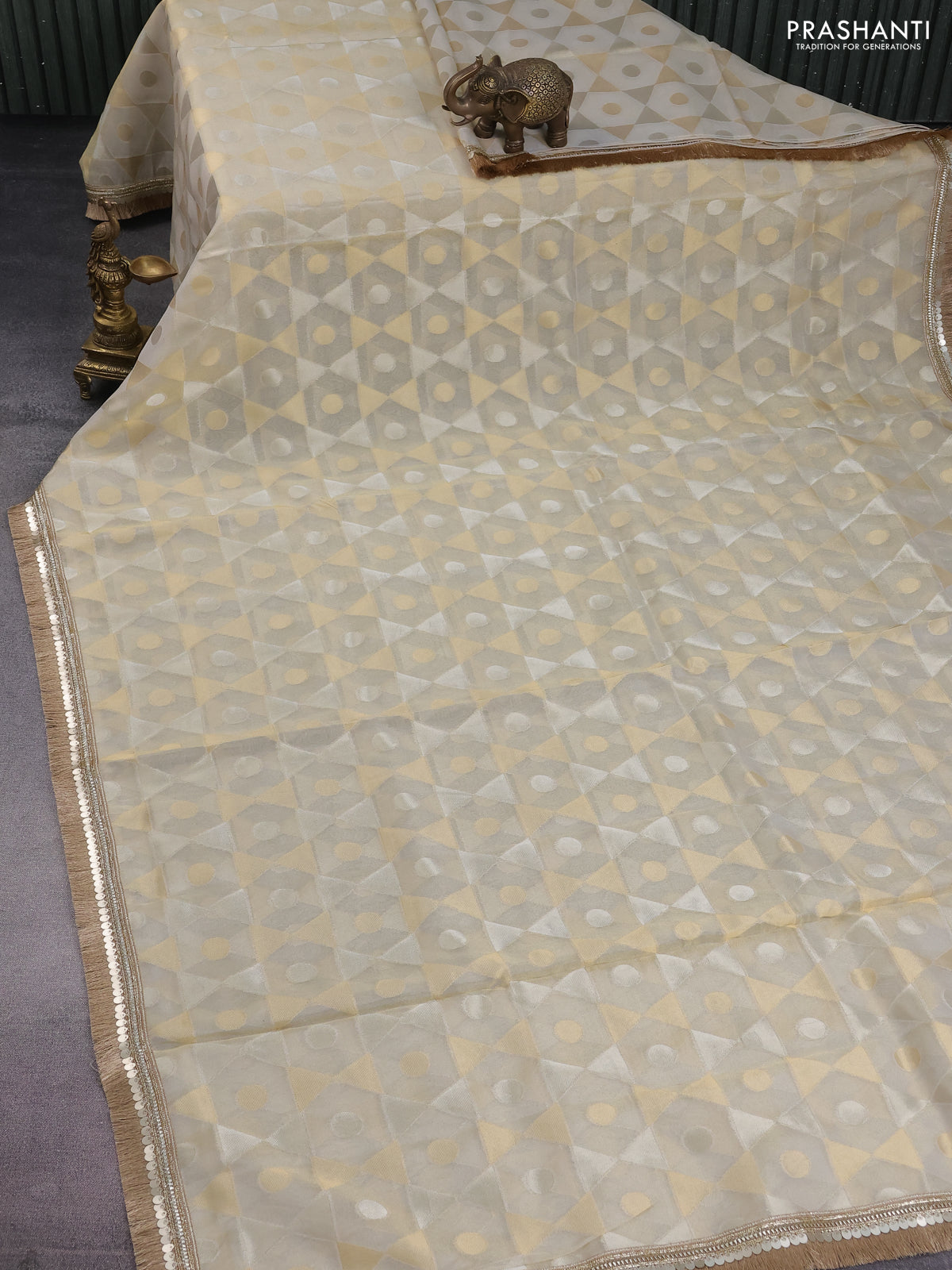 Banarasi tissue saree beige and mustard yellow with allover zari woven geometric wevaes and lace work border