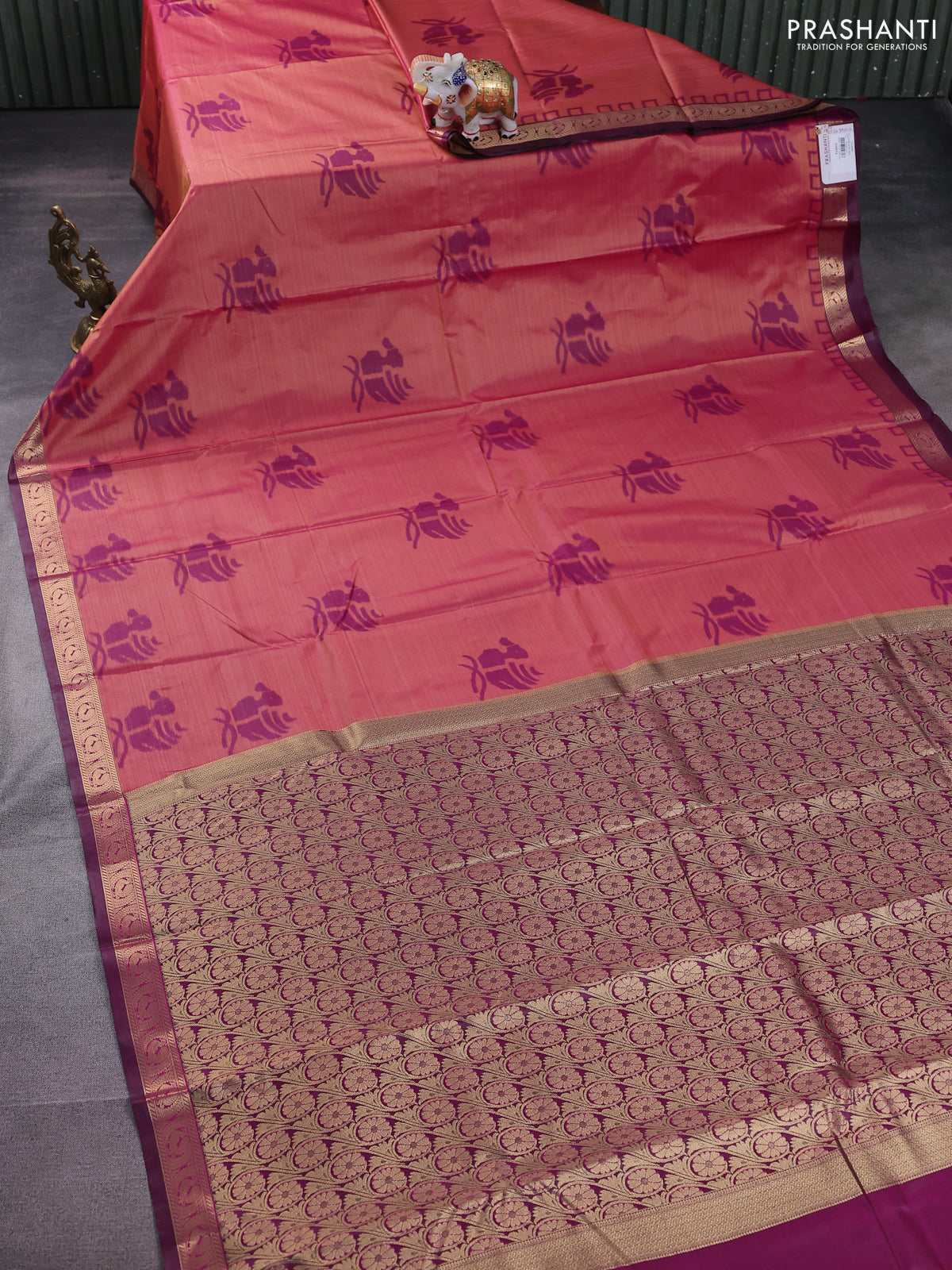 Bangalori semi silk saree dual shade of pinkish yellow and dark magenta pink with allover ikat butta weaves and zari woven border