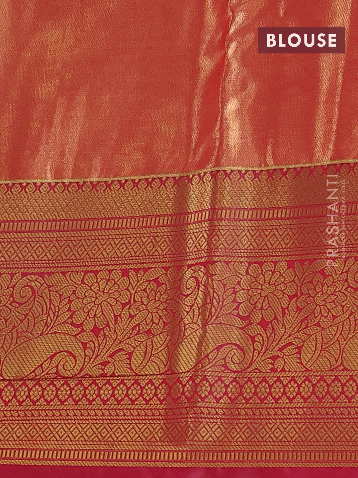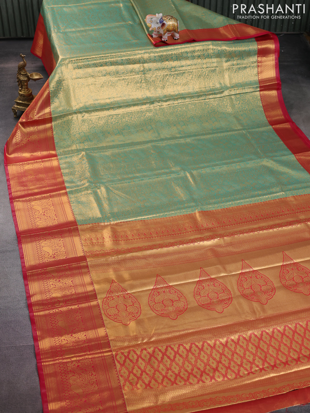 Bangalori tissue silk saree teal green shade and reddish pink with allover zari woven brocade weaves and long zari woven border