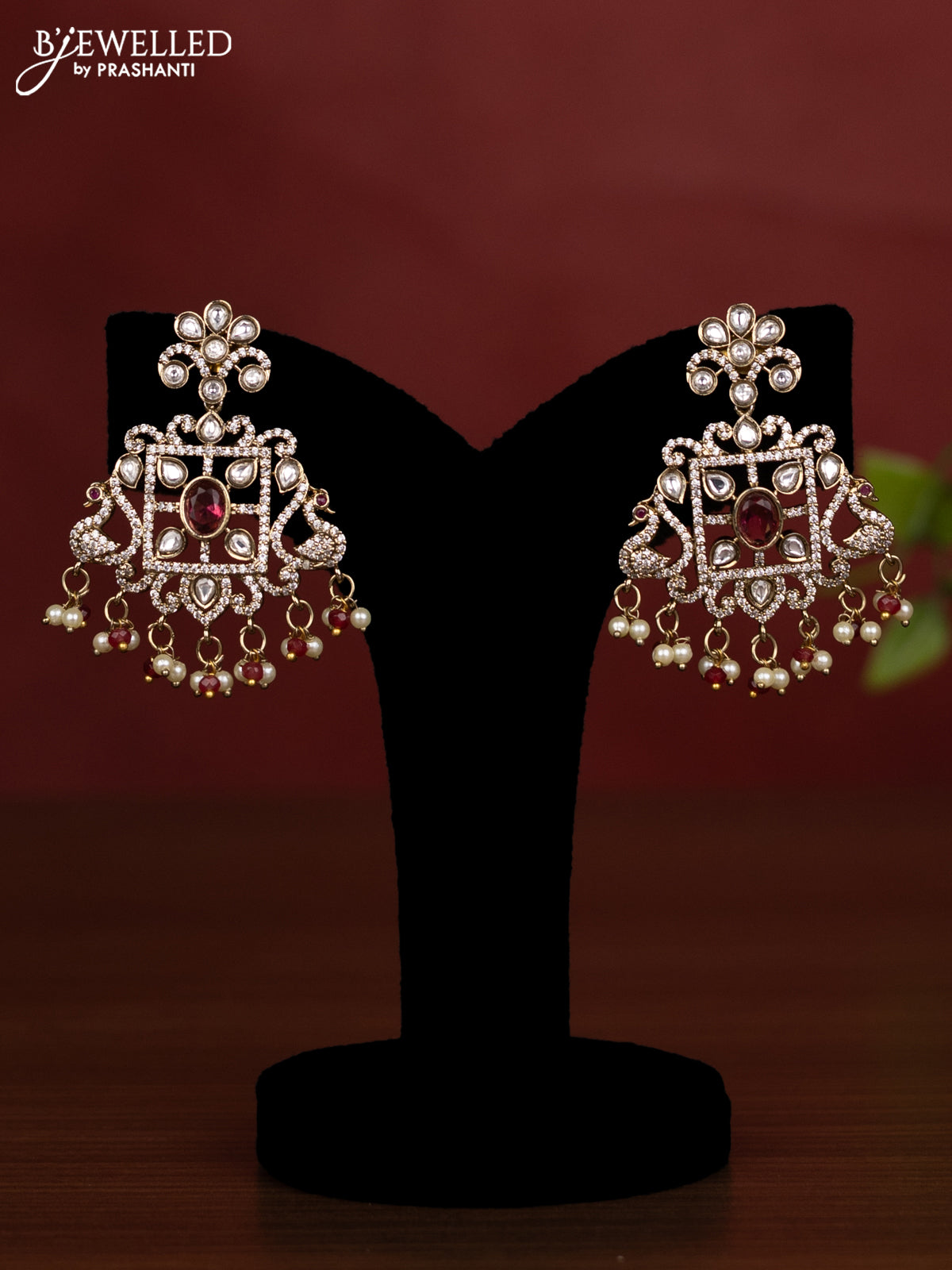 Beaded multilayer maroon necklace with ruby kundan & cz stones and pearl & beads hanging in victorian finish