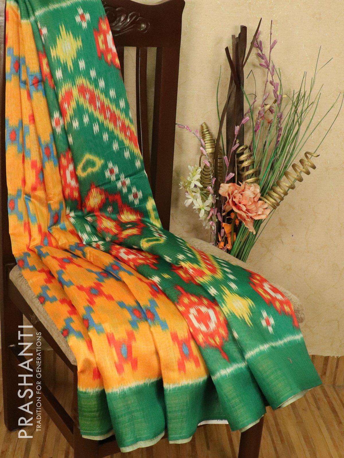 Bhagalpuri saree mango yellow and green with allover ikat prints and simple zari border
