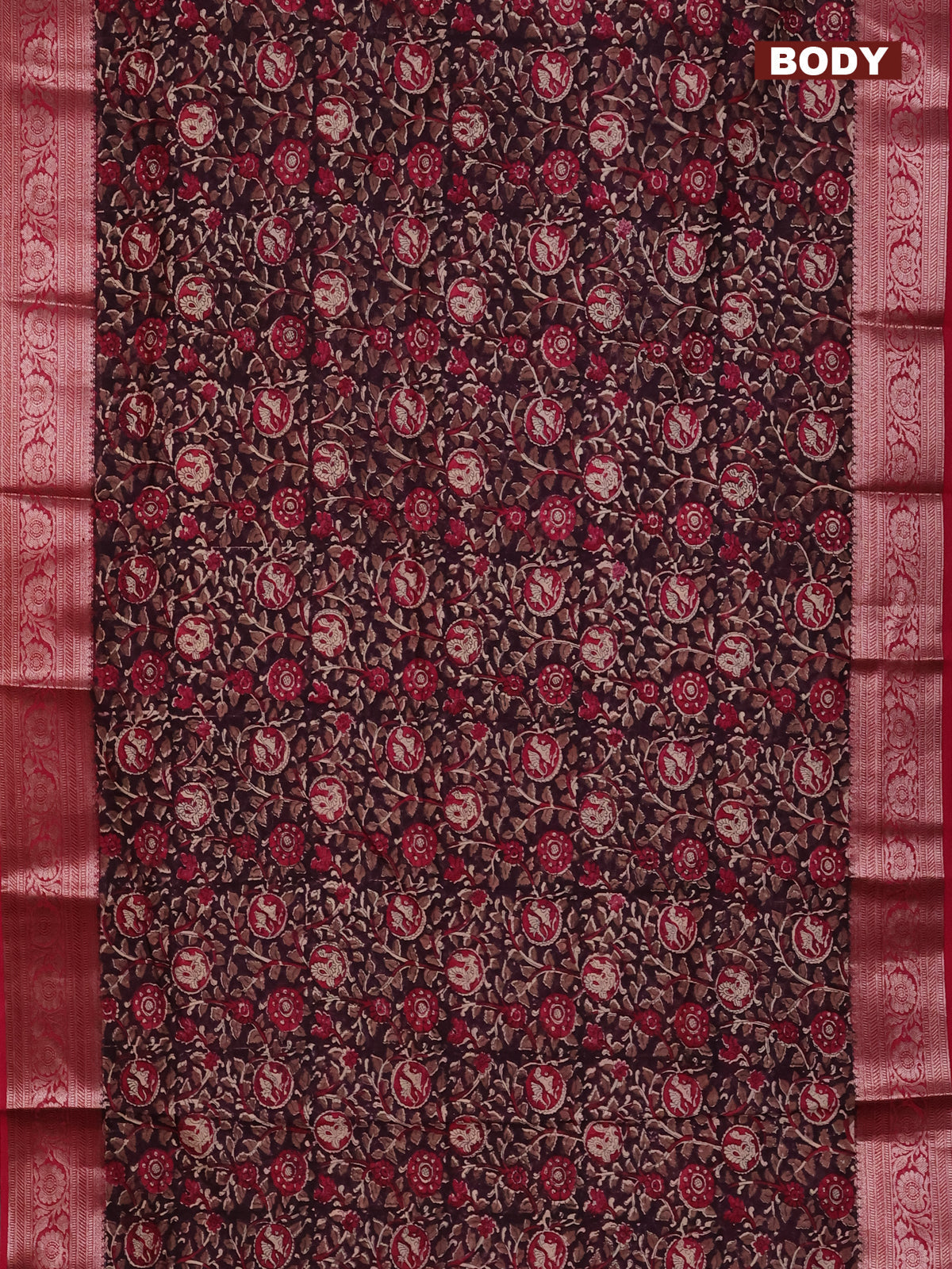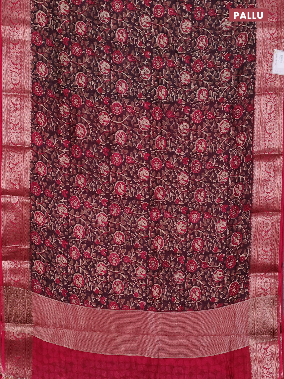 Chanderi silk cotton saree wine shade and pink with allover kalamkari prints and banarsi style border