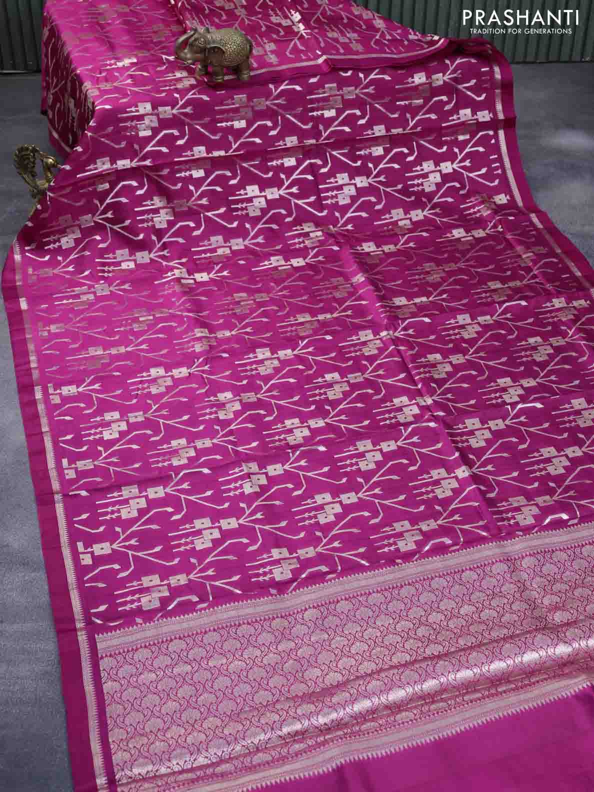 Chiniya silk saree pink with allover silver zari weaves and zari woven simple border