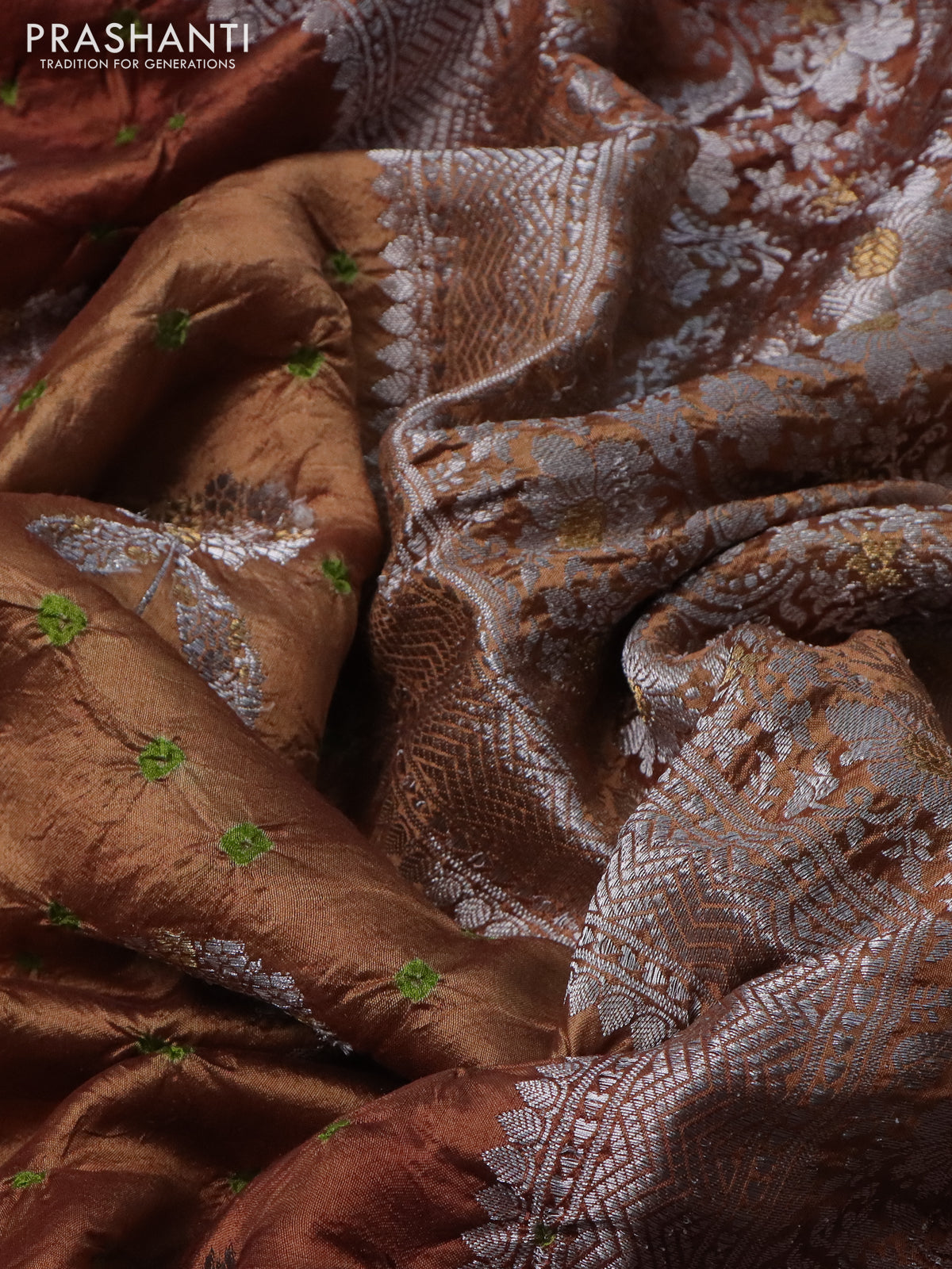 Chiniya silk saree rust shade with allover silver zari buttas & bandhini prints and silver zari woven border