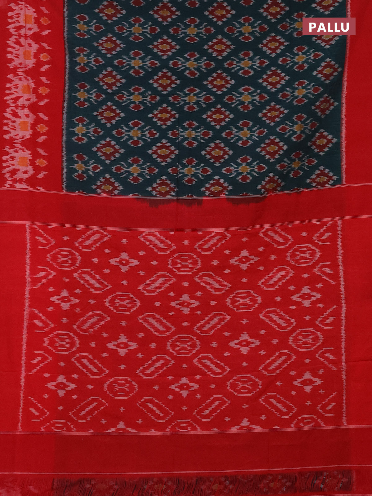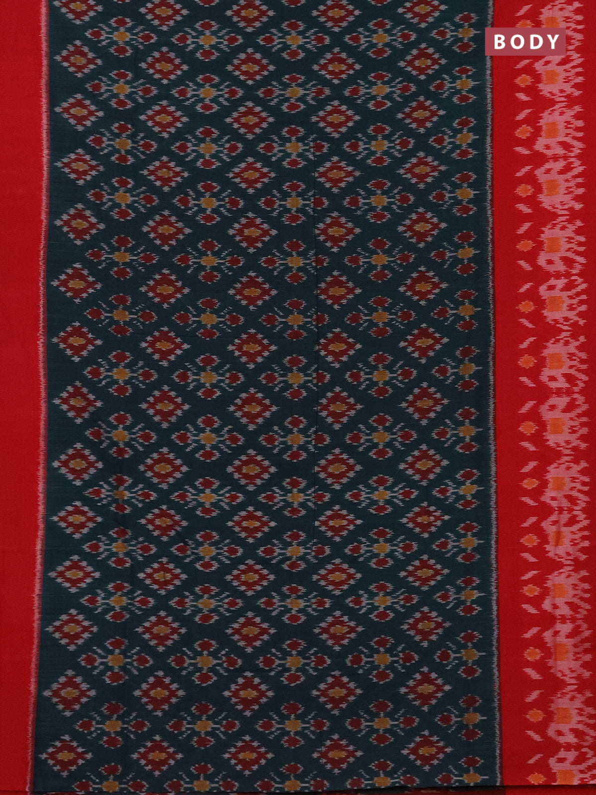Ikat cotton saree peacock green and red with allover ikat butta weaves and long ikat style border