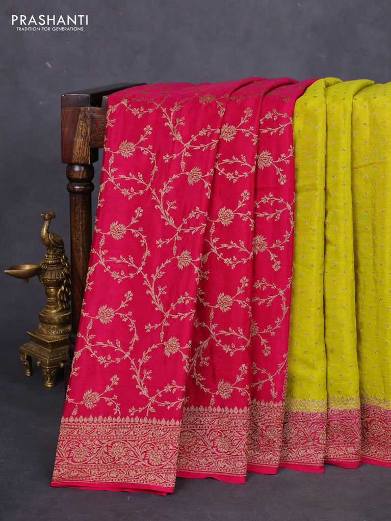 Banarasi crepe partly saree lime yellow and pink with allover thread & zari woven butta weaves and woven border