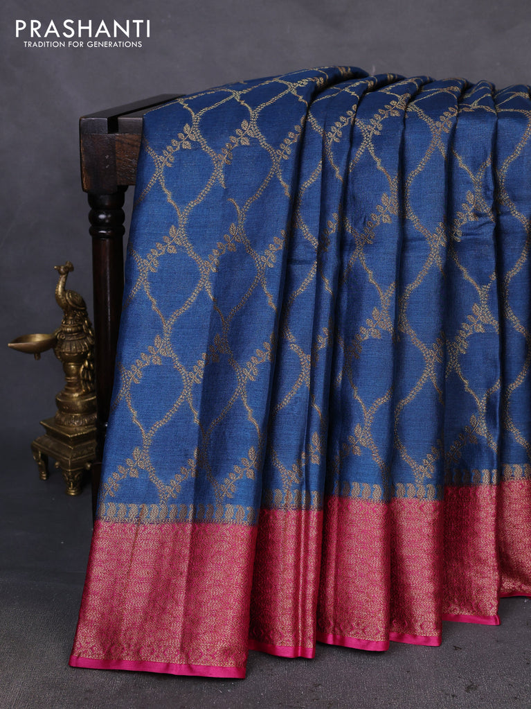 Banarasi tussar silk saree peacock blue and dark pink with thread & zari woven buttas and small woven border