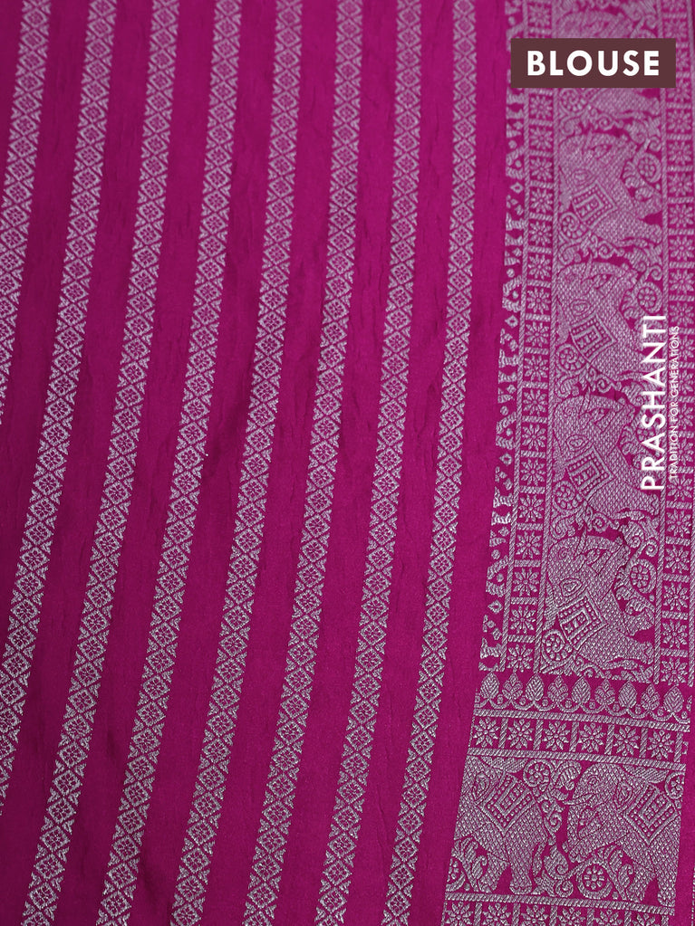 Banarasi crush crepe saree pink with plain body and silver zari woven elephant border