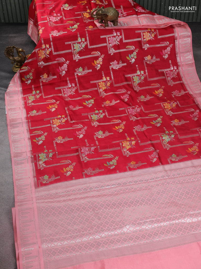 Banarasi poona silk saree red with silver zari woven buttas and silver zari woven border