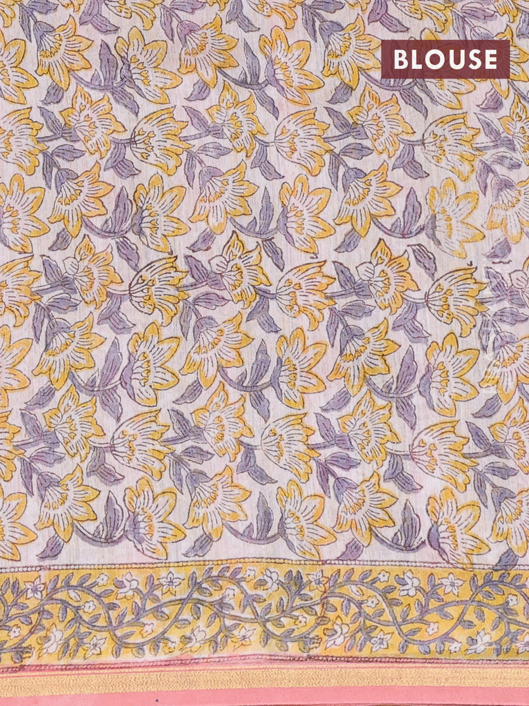 Chanderi bagru saree peach pink and off white with allover floral butta prints and small zari woven border