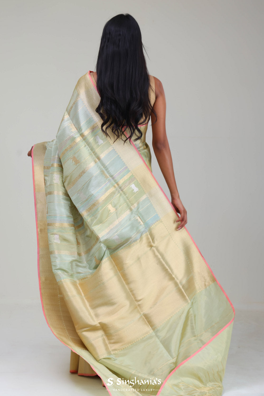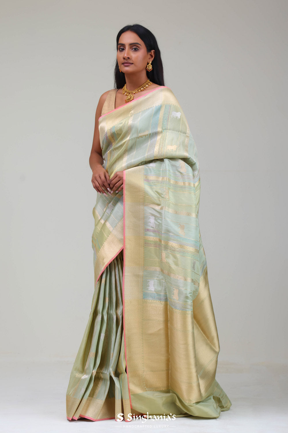 Delicate multicolour green banarasi saree is crafted from tissue fabric, featuring floral stripe and cow patterns with gold and silver accents all over the body and small border and pallu with pink edging. The saree is suitable for festive and wedding occasions.