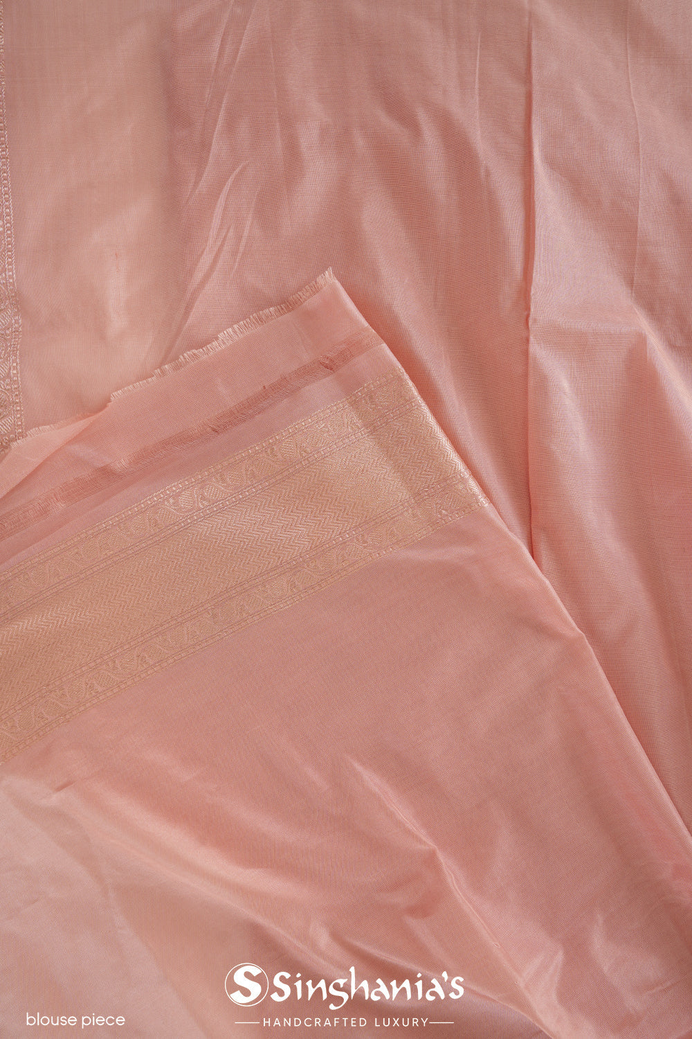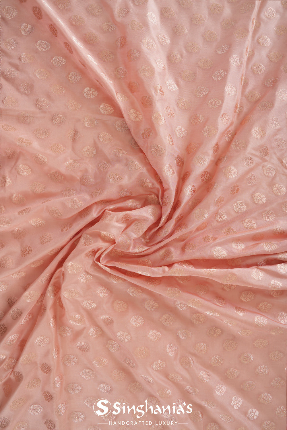 Delicate heather peach banarasi saree is crafted from silk fabric, featuring floral butti patterns with gold accents across the body and small border and pallu with floral-geometric design & self edging. Perfect for festive and wedding occasions.