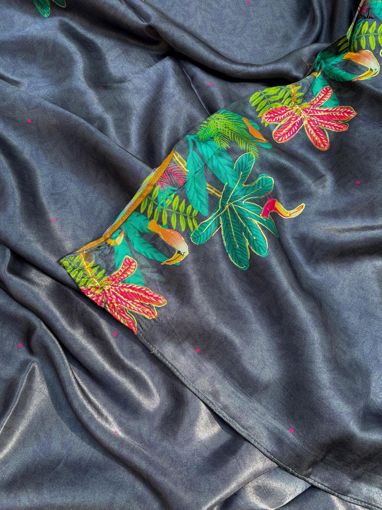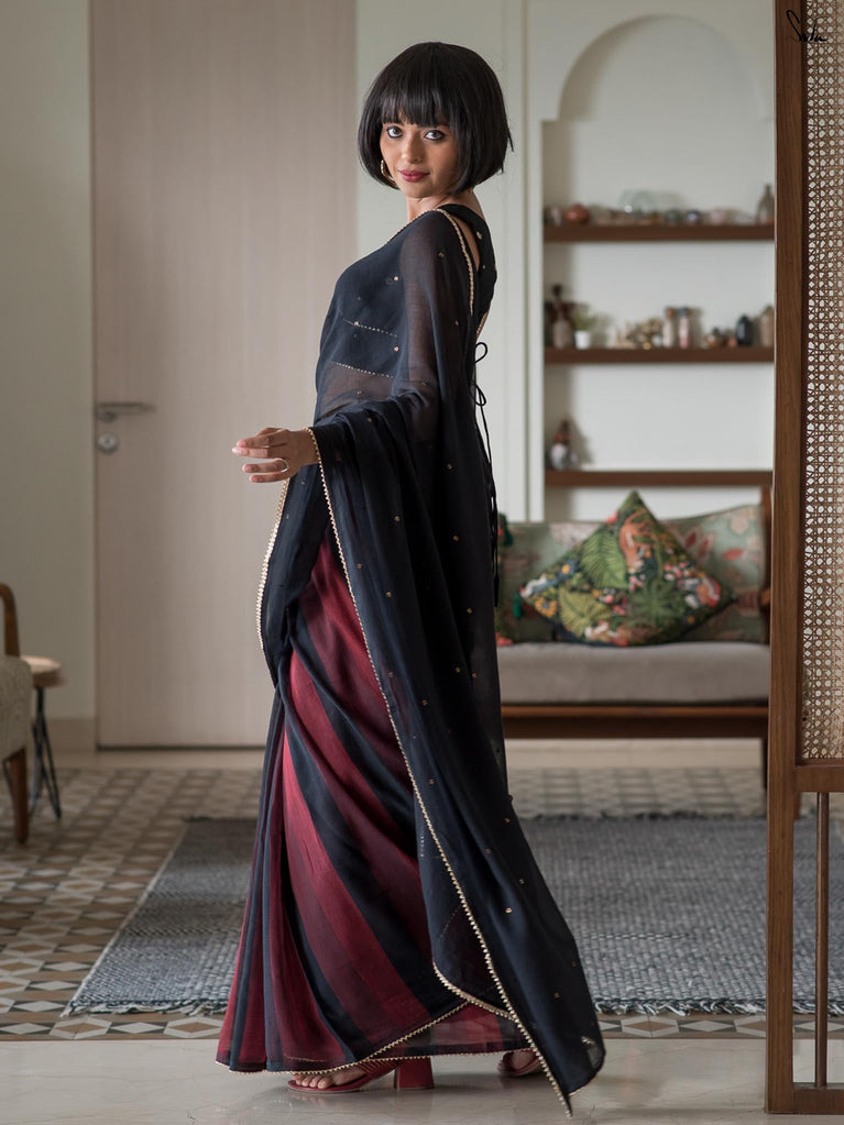 The model is wearing size S blouse and the saree is Black Fuchsia Fiza.