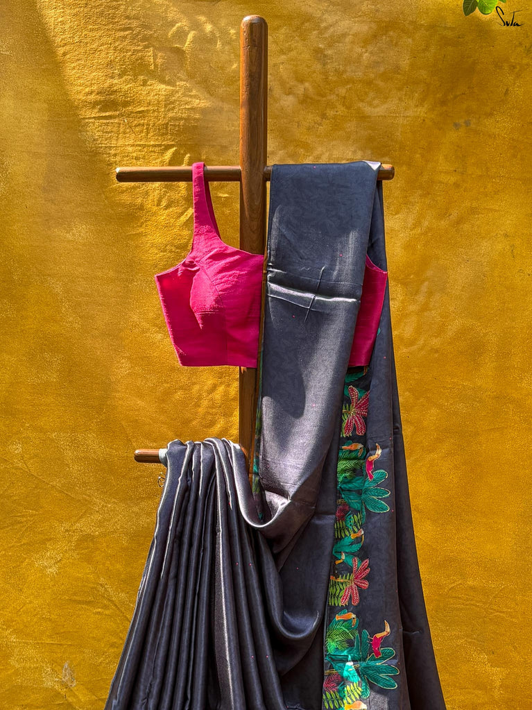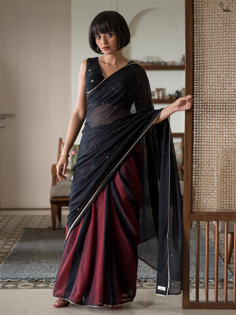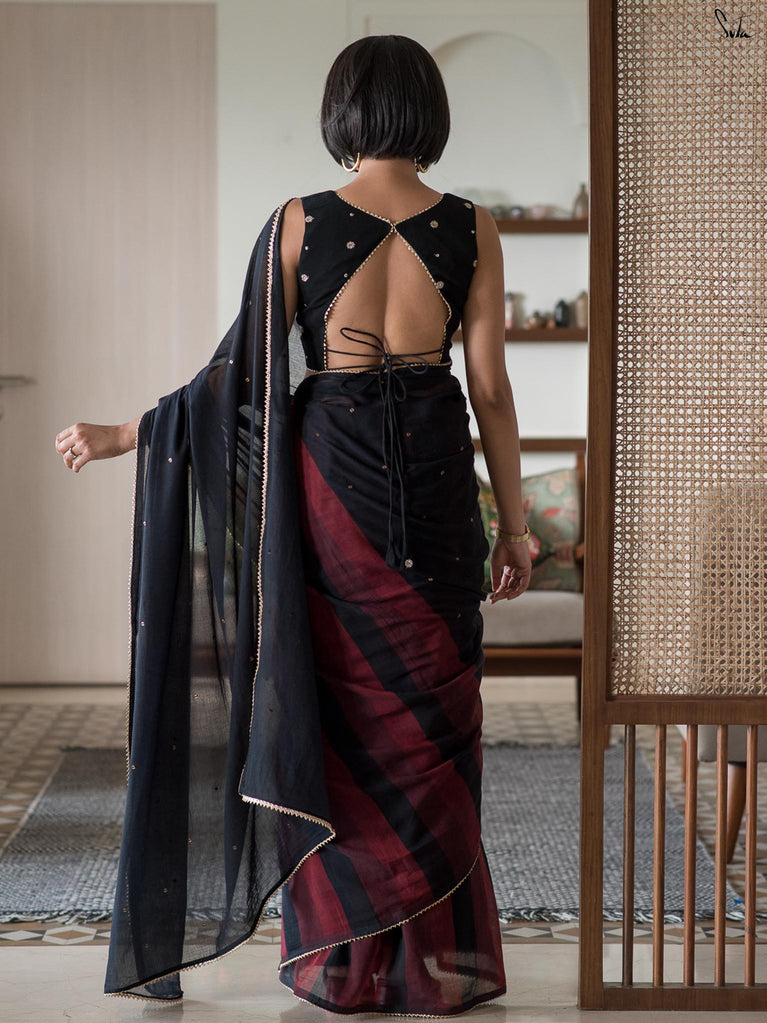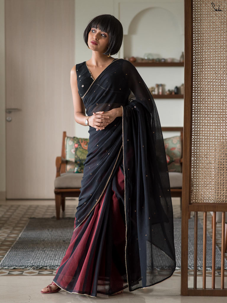 A black base saree that’s easy to wear and easy to style. Made from a soft cotton-linen blend, this saree feels light, breathable, and comfortable for all-day wear.Digital floral prints inspired by fuchsia flowers run across the saree, adding a fresh pop against the black base. Finished with delicate contrast red lace detailing, it brings just the right amount of colour and character without feeling overdone.Ideal for everyday workwear, casual office days, or simple outings when you want something effortless yet put together.