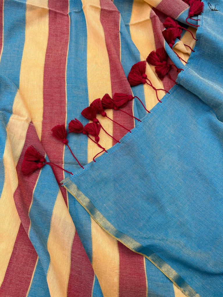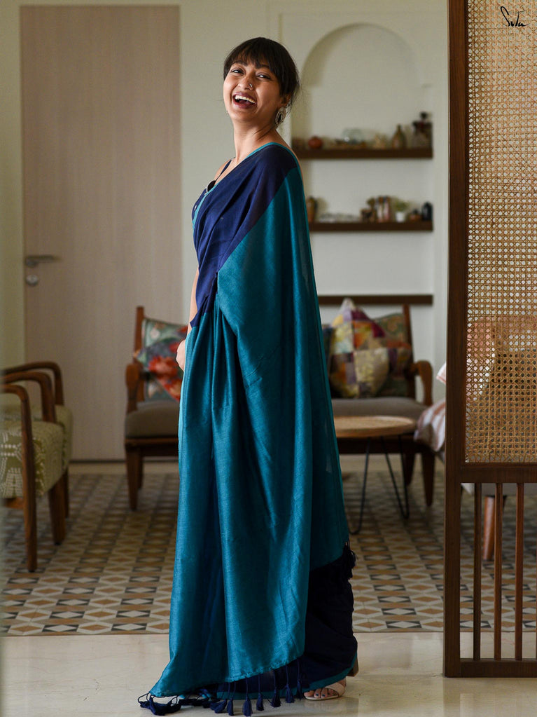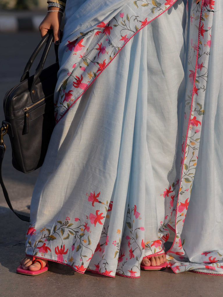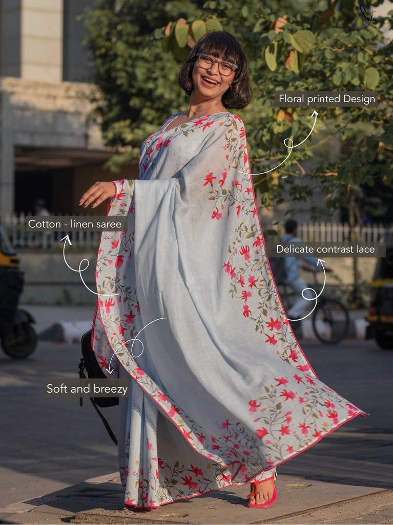 A fresh blue base saree designed for easy, everyday wear. Made from a soft cotton-linen blend, this saree is breathable, lightweight, and comfortable enough to carry through long workdays.The saree features digital floral prints inspired by fuchsia flowers, adding a soft contrast to the blue base. Delicate pink lace detailing along the border brings in a subtle pop of colour, keeping the look balanced and wearable.Ideal for office wear, casual meetings, or everyday outings when you want something simple yet polished.