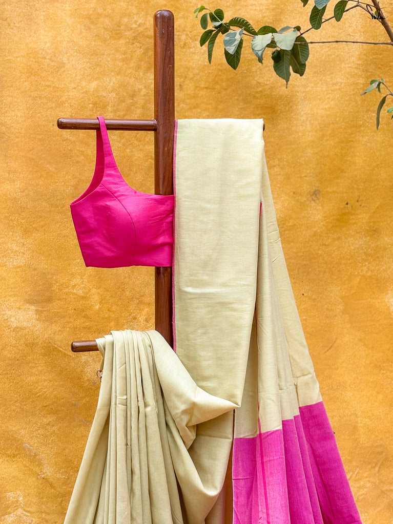 She drapes the saree absentmindedly, the cotton-linen light against her skin. Fuchsia florals appear gently, never interrupting the calm, just adding colour where it’s needed. Pink lace follows the edge like a quiet reassurance.