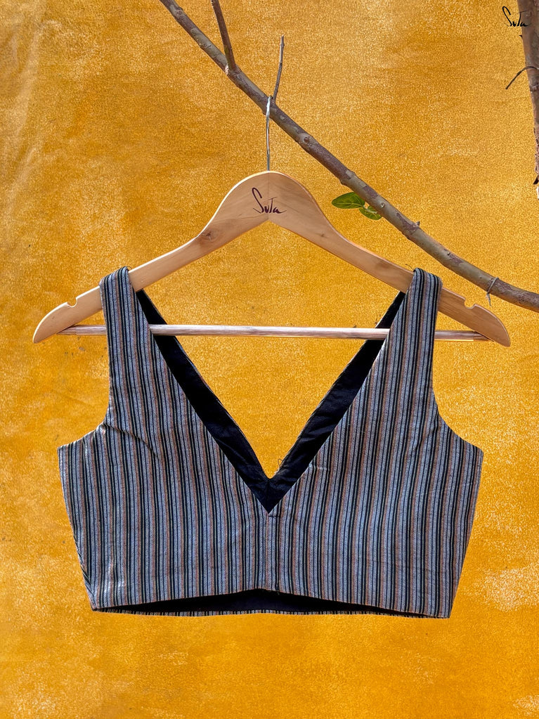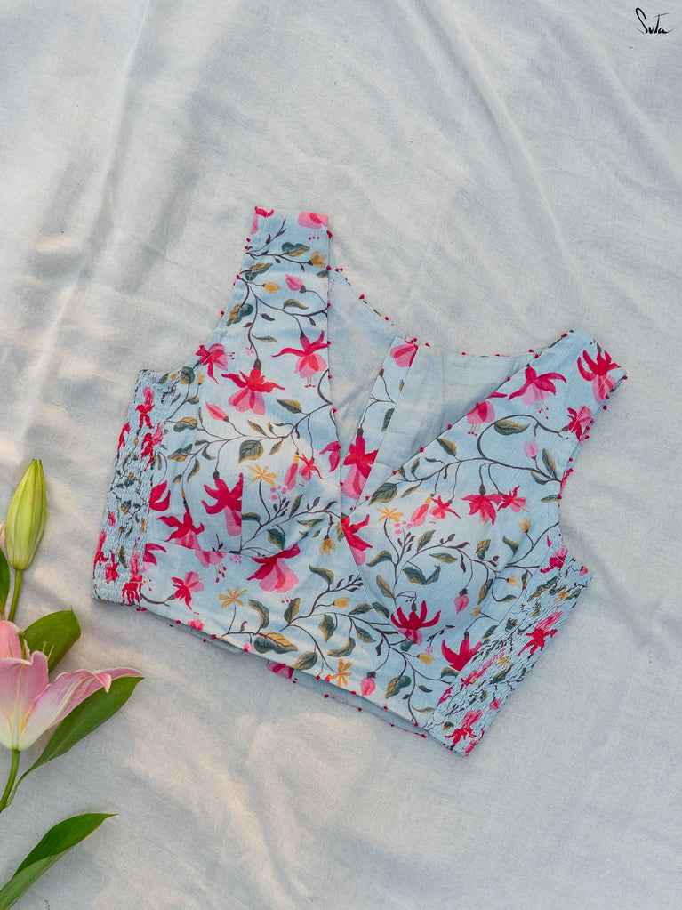 A comfortable everyday blouse designed with thoughtful details. Made from a soft cotton-linen fabric, this blouse is breathable, lightweight, and easy to wear for long hours.It features a blue base with digital floral prints and a flattering V neckline. Red French knot detailing along the neckline adds a subtle contrast and handcrafted touch. The sleeveless silhouette keeps the look light and versatile.Finished with a zip opening at the back and smocking on the sides, the blouse offers a flexible fit and easy wear, making it ideal for everyday and workwear styling.
