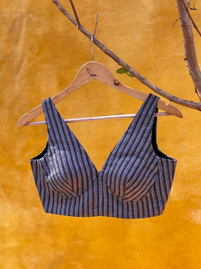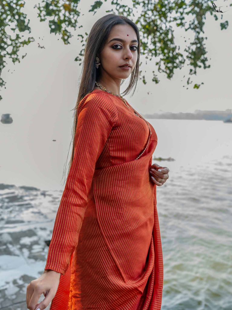 A radiant red blouse crafted from viscose zari with zari stripes. The boat-neck style and full sleeves offer comfort, with a front hook opening for easy wear.