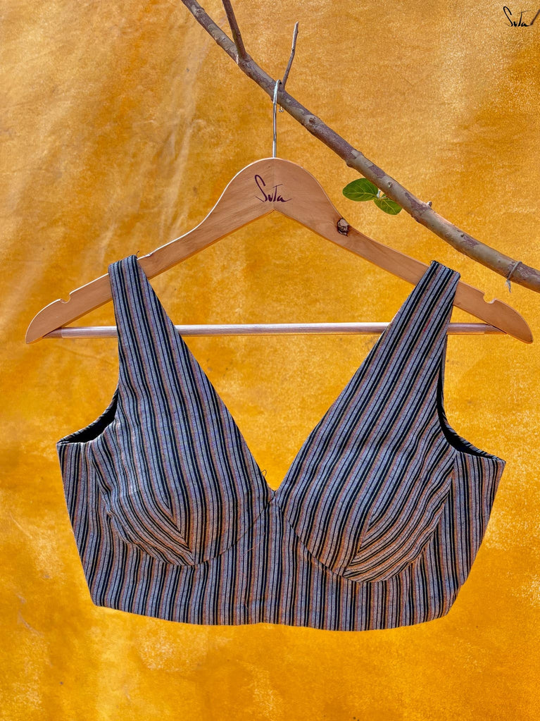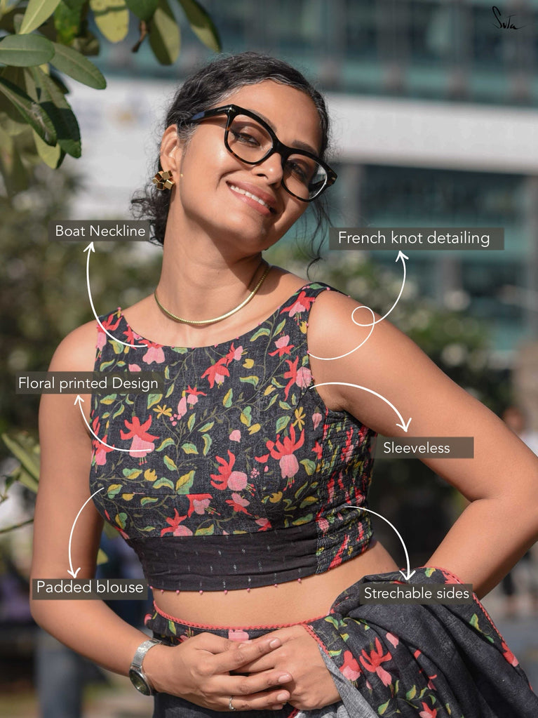 A comfortable everyday blouse with thoughtful details. Made in a soft cotton-linen fabric, this blouse feels breathable and easy to wear for long hours.It features a black base with digital floral prints, paired with a classic boat neckline. Delicate French knot detailing on the neckline and sleeves adds a subtle handcrafted touch. The sleeveless silhouette keeps it light and fuss-free.Designed with back hook opening and smocking on the sides, this blouse offers a flexible and comfortable fit, making it ideal for regular wear.