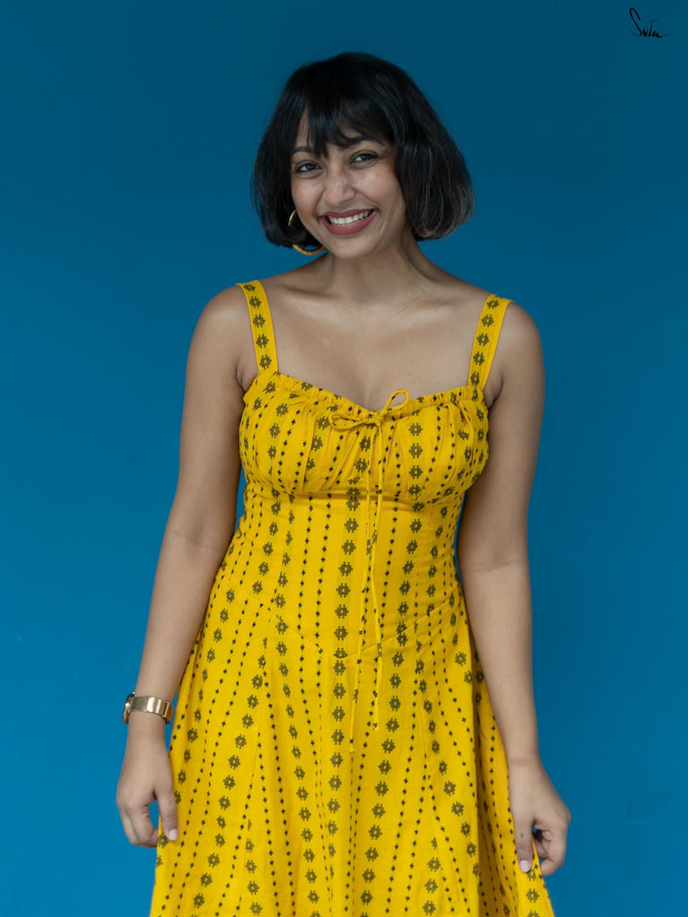 Taking inspiration from the endless hide-and-seek of the winter sunshine, the sleeveless yellow dress is as radiant as a ray of light. Woven from soft, delicate cotton fabric, the dress features a sweetheart neckline and a side zip. Embrace the beauty of 'Dhoop or Chao' and illuminate your surroundings with its warmth and energy.