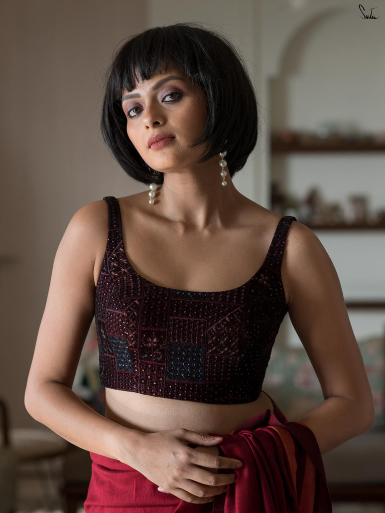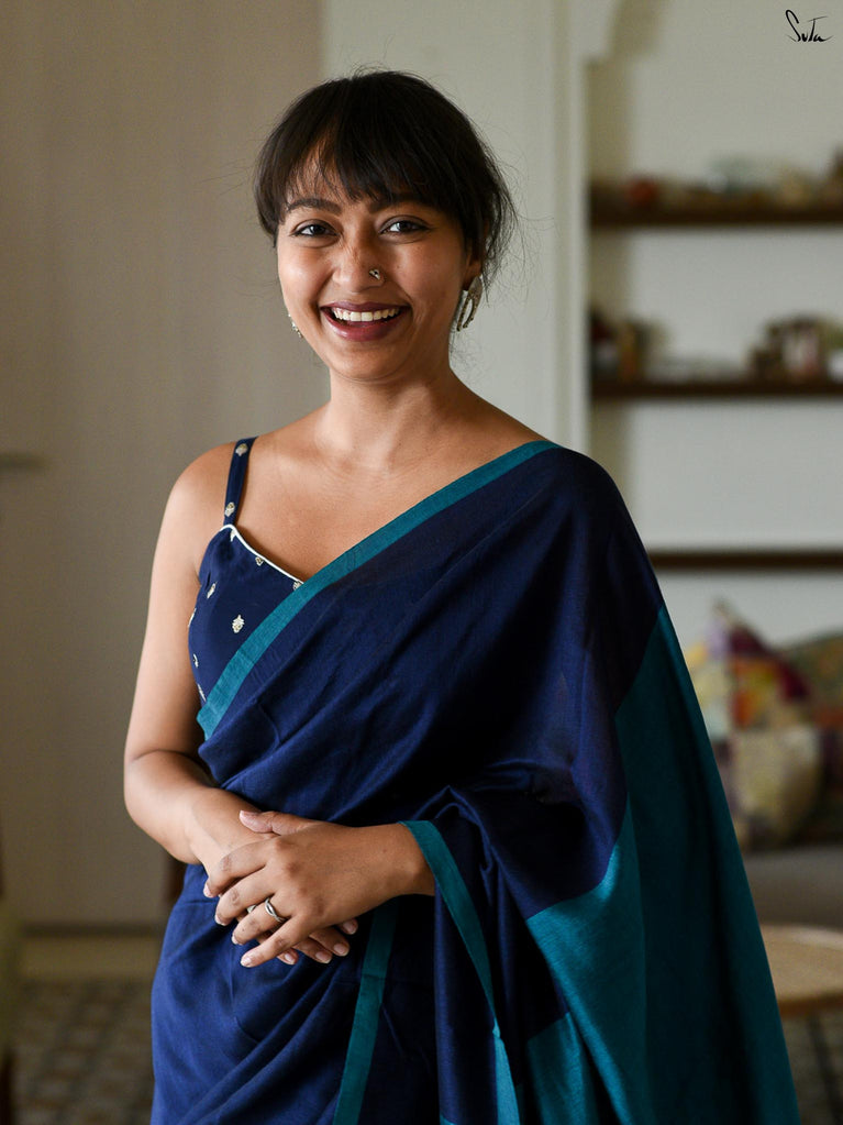 The model is wearing size S blouse and the saree is Blue Fuchsia Fiza.