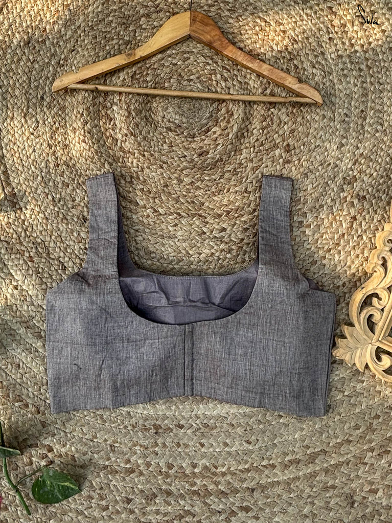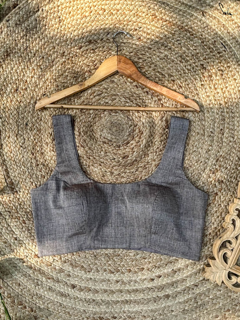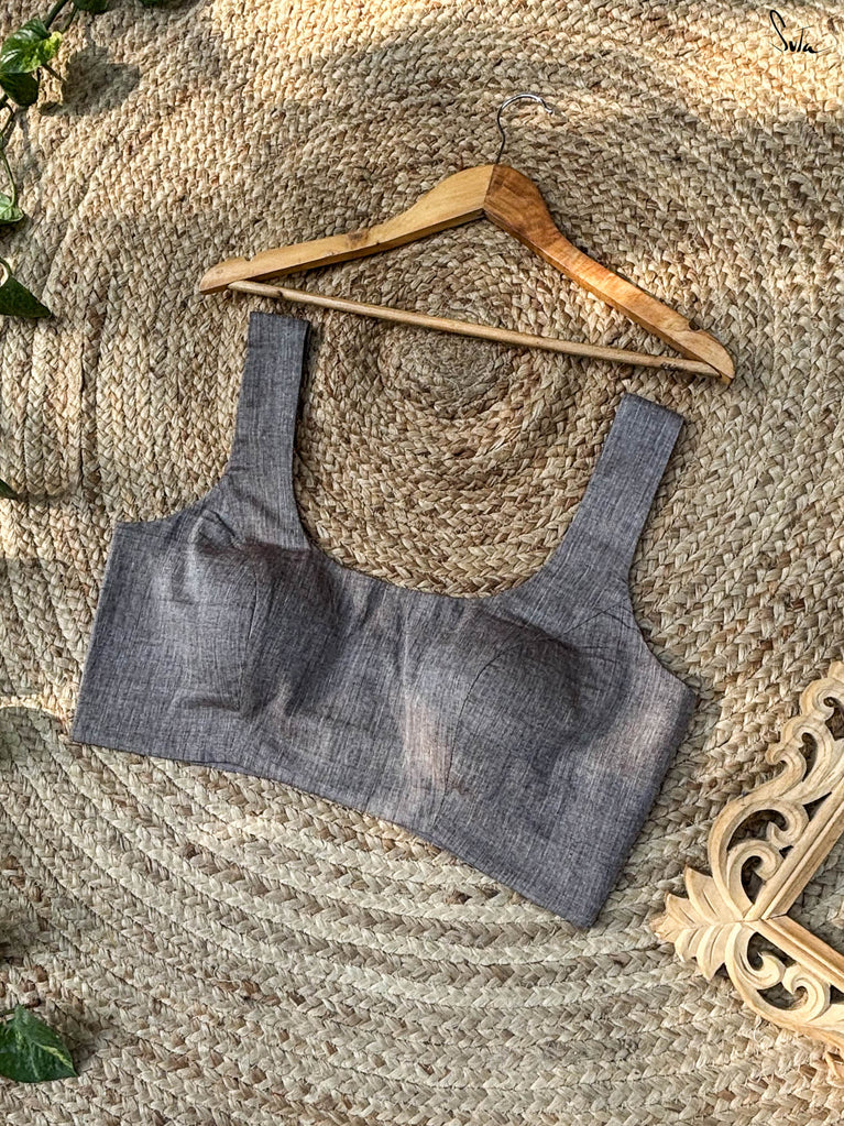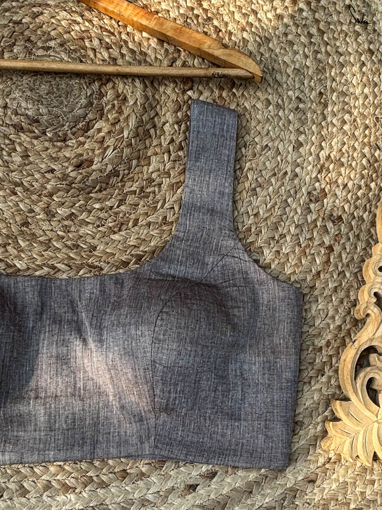 A little shimmer, a little sass, Uski Chaandi is all heart. This purple linen blouse is a playful take on timeless elegance, featuring delicate machine embroidery that glows like starlight. The V neckline and sleeveless cut lend it a modern, flattering silhouette, perfect for drapes that call for a hint of bold charm. It’s that one blouse you’ll reach for again and again when grace needs just a touch of mischief.