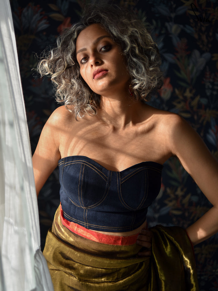 The model is wearing size S blouse and the saree is Chulbuli Indiglow