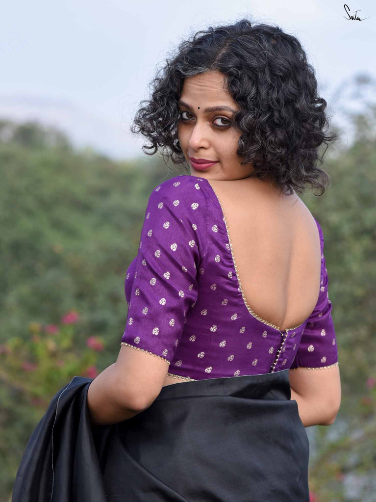 The model is wearing size S blouse and the saree is Chulbuli Indiglow