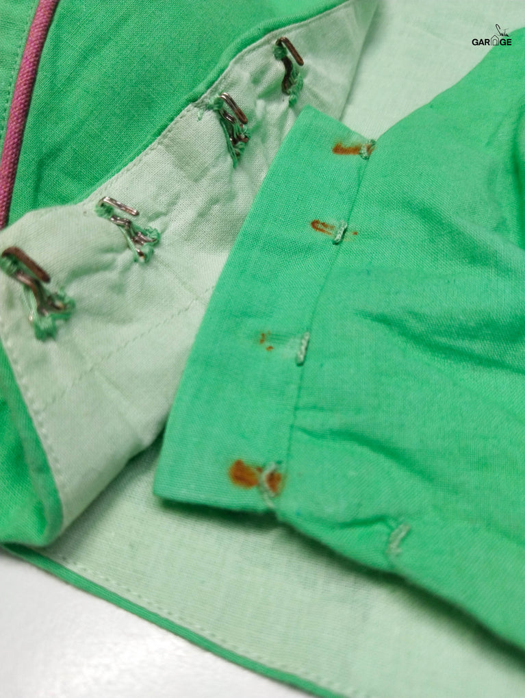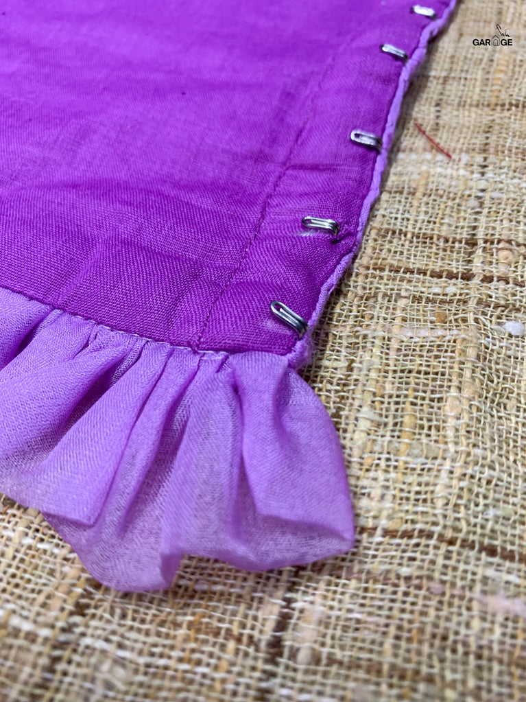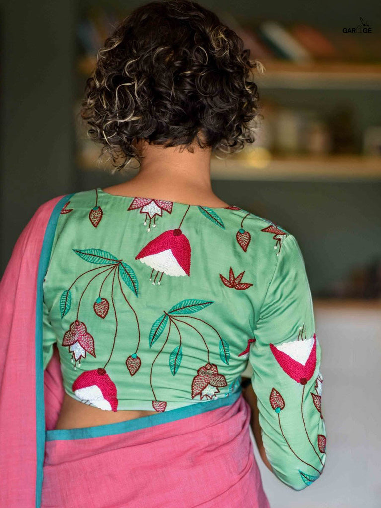 Cotton fabric dates back to some of the most ancient civilisations and it has a strong presence in the modern wardrobe as well. The incredible softness and lightness of cotton combined with its strength and versatility makes it one of the most popular choices, especially for the Indian climate. The comfort and the amazing feel that cotton offers in unparalleled! The fabric used for this blouse is a machine-embroidered cotton fabric which is also known as Hakoba cotton.The ruffle detailing on the blouse is made of organza fabric.Organza is a type of weave that creates light-weight, breathable, dreamy, translucent fabric that brings a certain ethereal charm to apparel. This weave also renders a characteristic stiffness, which beautifully comes together with the overall fluidity of the fabric. Organza can be made with different types of fibres. For this blouse, the organza weave is made of polyester.