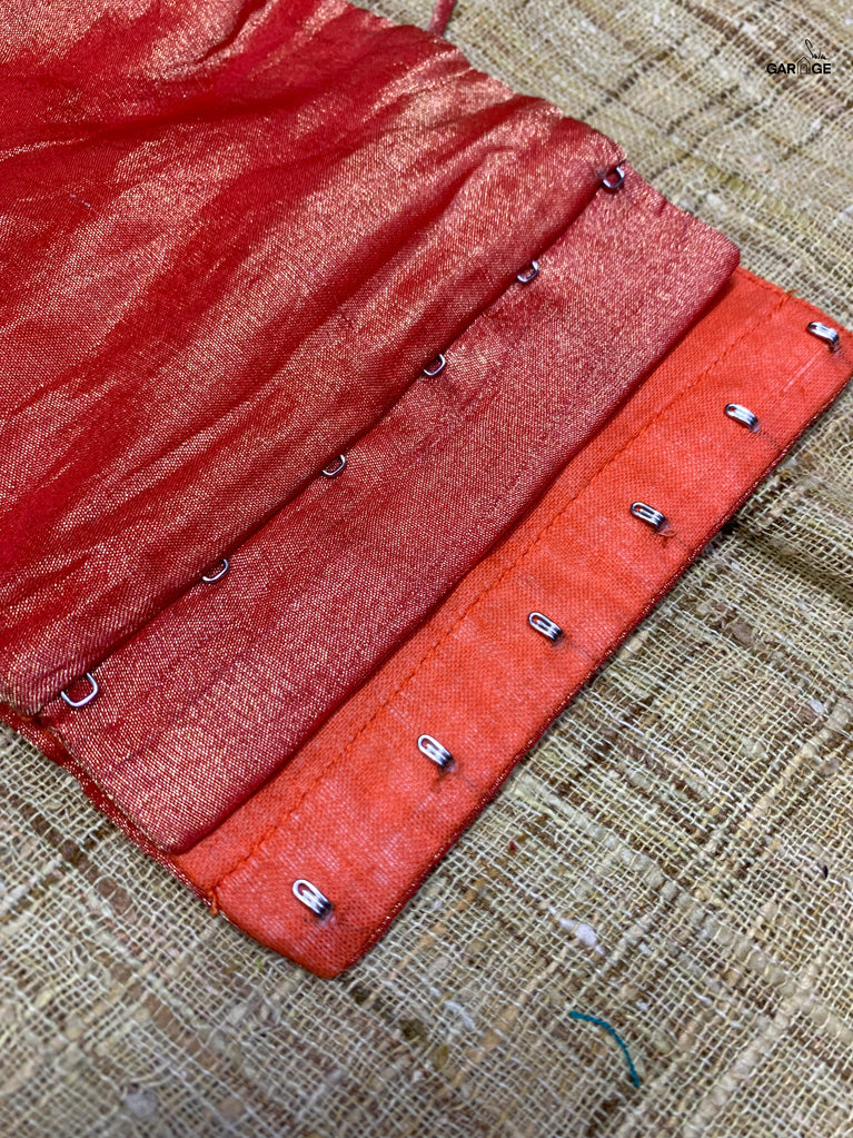 This blouse is made of a beautiful tissue silk fabric.Tissue silk is one of the most delicate fabrics that exude royalty. This fabric is well known for its luster and fine finish. The tissue silk fabric is woven together out of very fine silk threads and zari threads, making it super light as well as illuminant. The subtle sheen of the fabric makes the blouse perfectly spotlight ready!