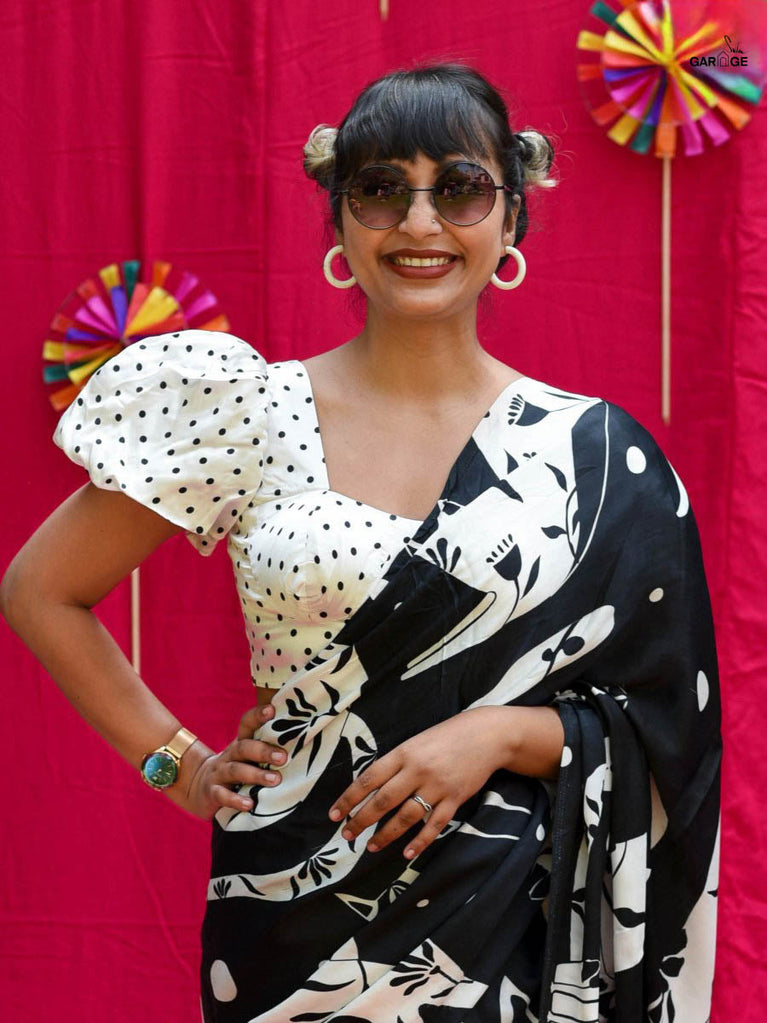 Su, the model is wearing size S blouse and the saree is Fireflies in the Garden Polka.