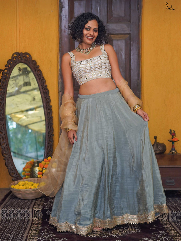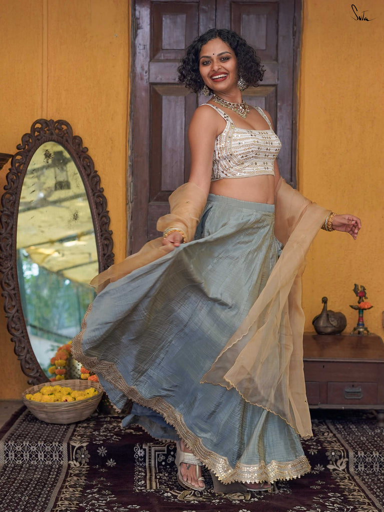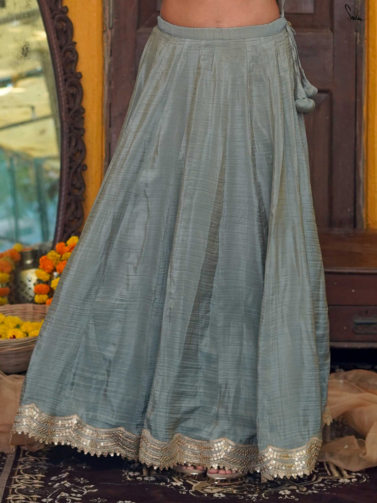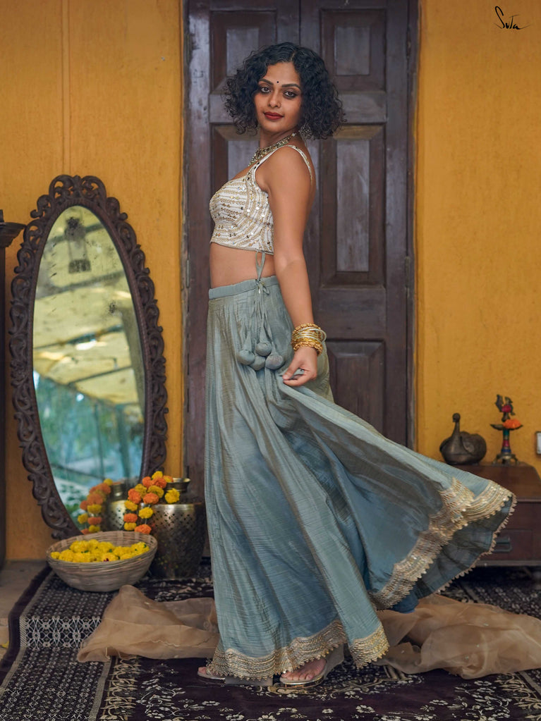 Mint green, light as a laugh shared mid-function. This crushed viscose lehenga is made for days that begin with “just getting ready” and end on the dance floor. The fabric has a soft festive sheen, fluid movement, and a roomy fall that lets you breathe, twirl, and sit cross-legged without a second thought. Finished with delicate scalloped gold lace and playful tassels, it brings just enough sparkle, never too much.Wear it with a blouse for the full festive look, drape it with a saree pallu, or style it as a skirt with your favourite crop top. Because when it’s bhai ki shaadi, comfort should still come first.