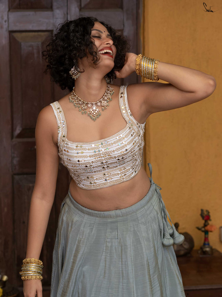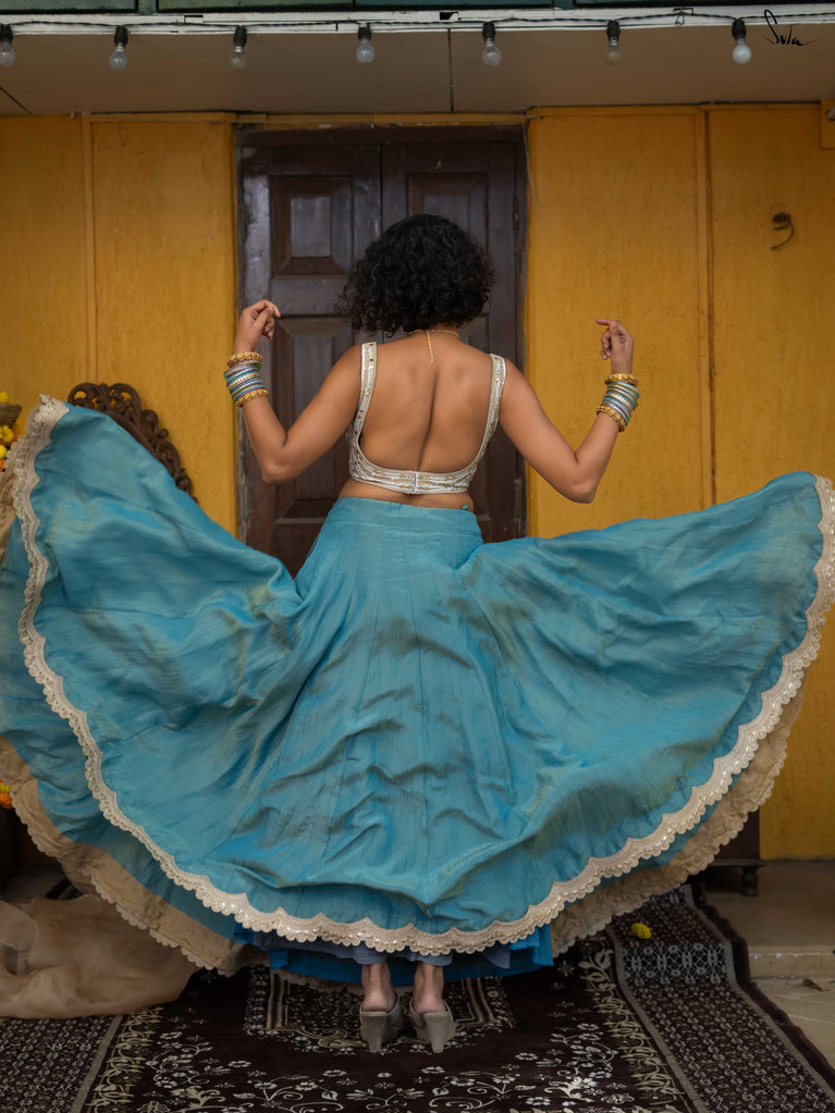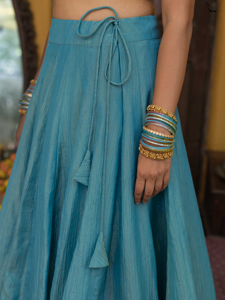 A bold blue for showing up unbothered and looking great doing it. This crushed viscose lehenga is made for celebrations where comfort is your power move. Light, fluid, and softly festive, it moves with you, whether you’re dancing, laughing, or just living your best life. Scalloped gold lace adds a hint of glow, while tassels keep it playful and fun.Wear it with a blouse, drape it with a saree, or style it as a skirt with your favourite crop top.Because sometimes, it’s not complicated. It’s just ex ki shaadi.